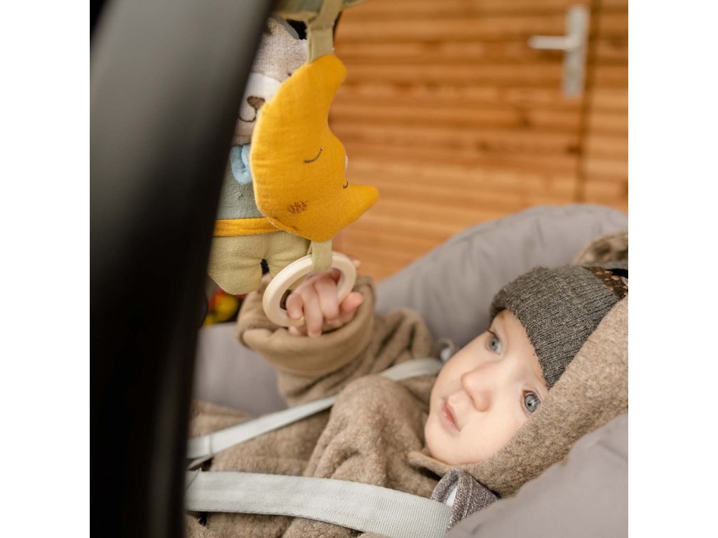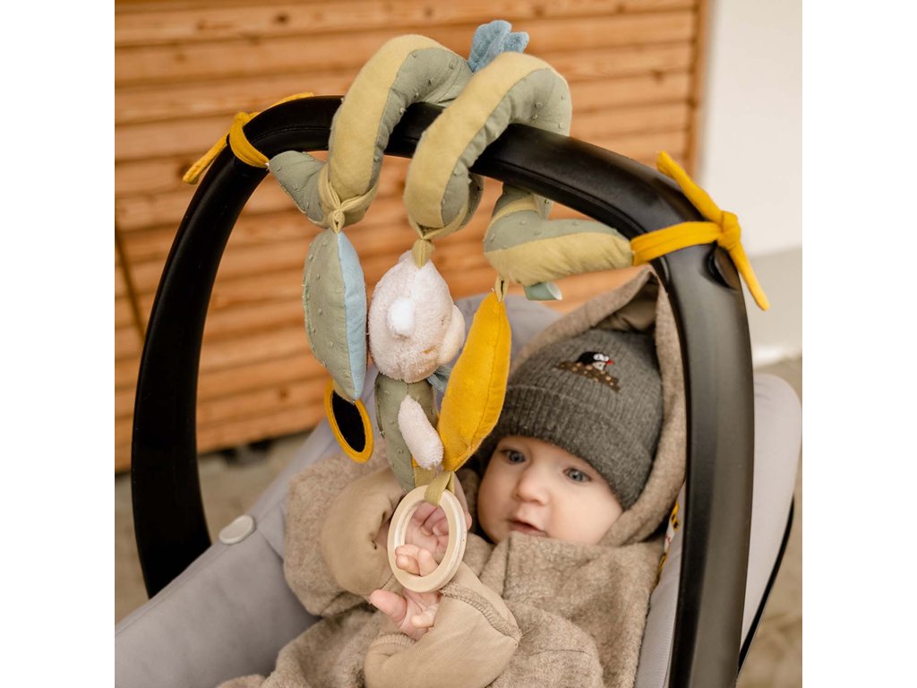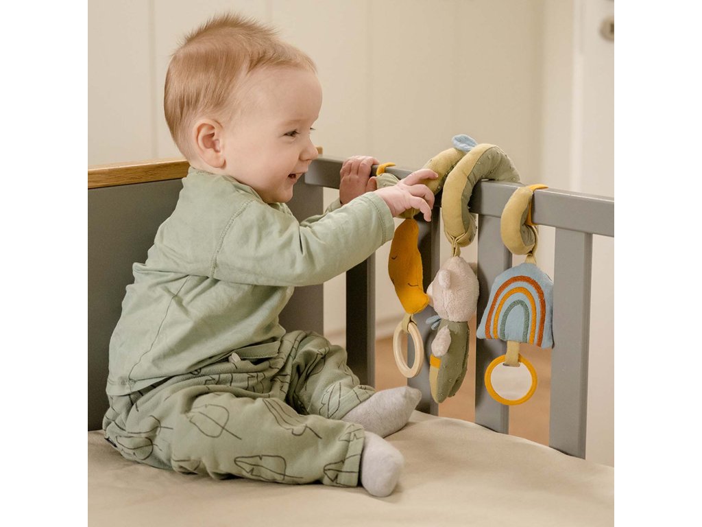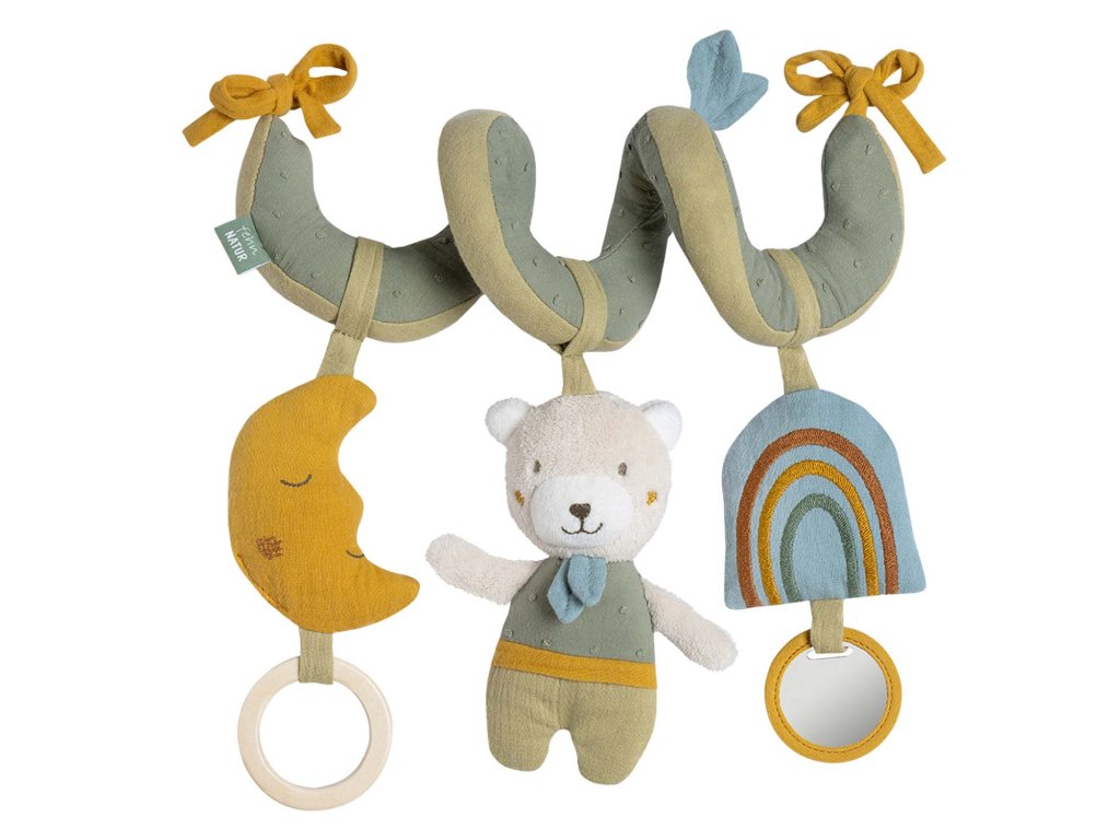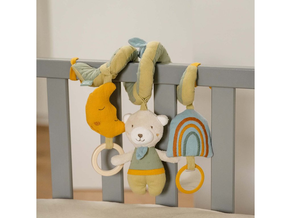 Medveď, mesiac aj dúha budú vášmu dieťatku nepostrádateľnými priateľmi či už v kočíku, autosedačke alebo v detskej postieľke. Na jednej špirále nájde váš malý dobrodruh všetky obľúbené hračky, ktoré zabavia a zároveň stimulujú jeho zmysly. Bezpečné zrkadlo, hryzátko, hrkálka, zvuky praskania a pískania stimulujú sluch a upútajú detskú pozornosť.