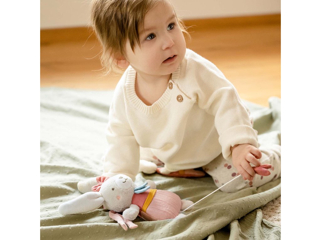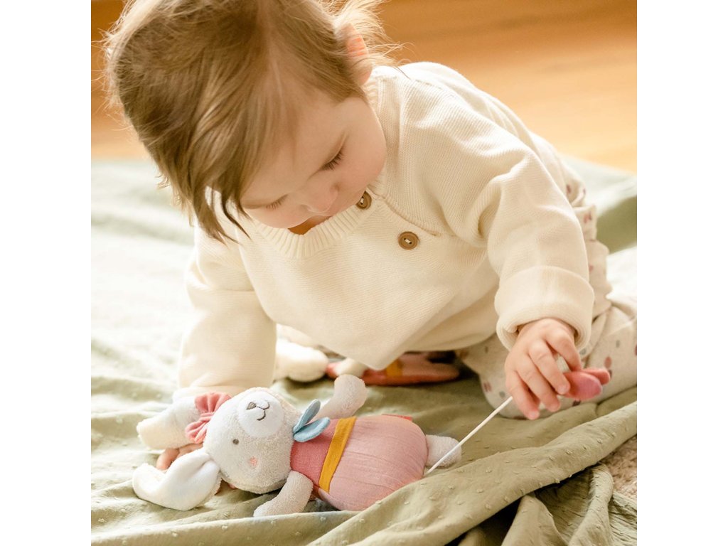 Vonkajšie materiály, ako je froté, džersej, mušelín a zamat, spolu s výplňou z ekologickej bavlny, lákajú na maznanie, objavovanie a hranie. Táto hračka je navrhnutá tak, aby podporovala zmyslový vývoj vášho dieťaťa.