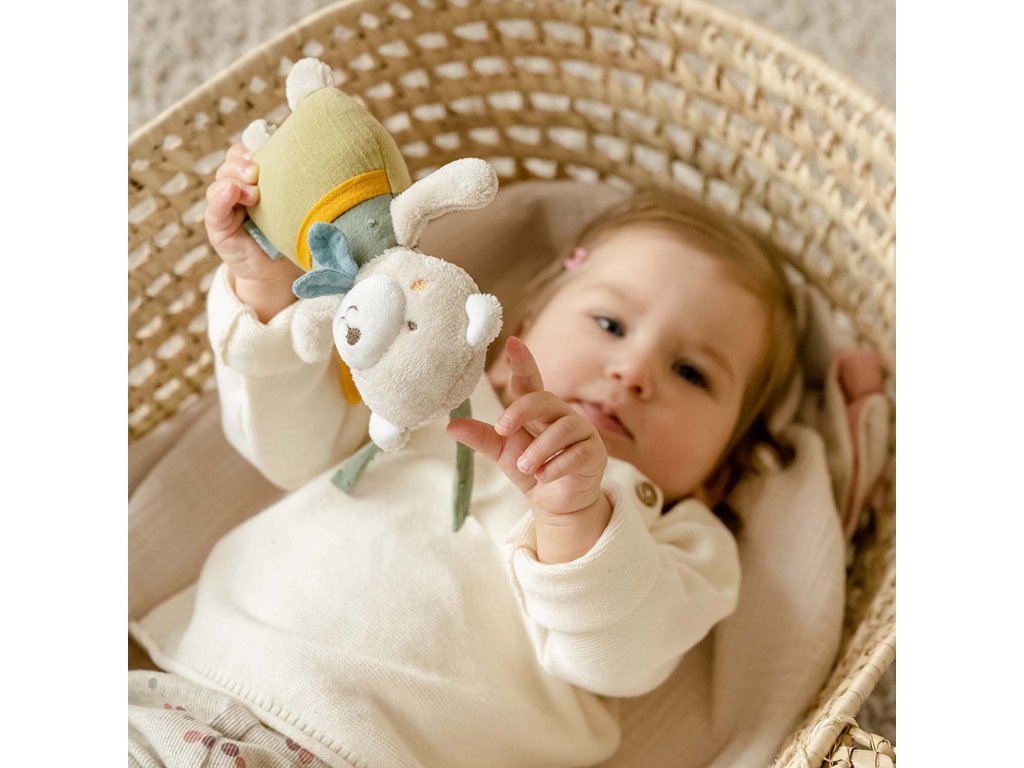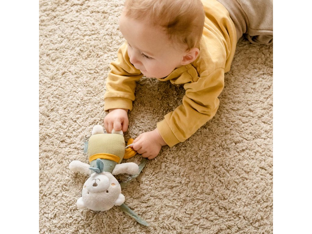 Vonkajšie materiály, ako je froté, džersej, mušelín a zamat, spolu s výplňou z ekologickej bavlny, lákajú na maznanie, objavovanie a hranie. Táto hračka je navrhnutá tak, aby podporovala zmyslový vývoj vášho dieťaťa.