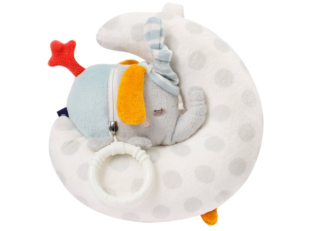 Plyšový sloník na mesiaci z mäkkého plyšového velúru upúta pozornosť každého dieťaťa na prvý pohľad. Môže slúžiť ako verný spoločník, ktorého možno vďaka popruhom pripevniť k postieľke, kočíku alebo lehátku. Môžete si ho tak vziať so sebou kamkoľvek bez rizika straty.