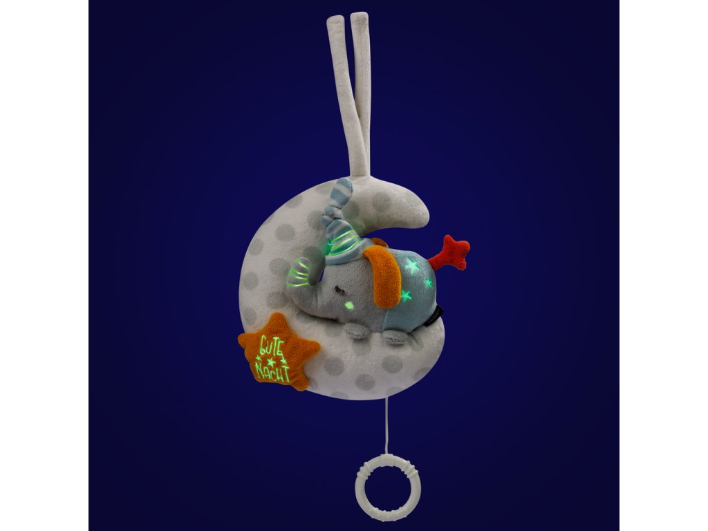 Svetelné prvky na hračke odstraňujú strach dieťaťa z tmy a vytvárajú pocit bezpečia. Slon má aj hrací mechanizmus, ktorý sa spúšťa zatiahnutím za šnúrku.