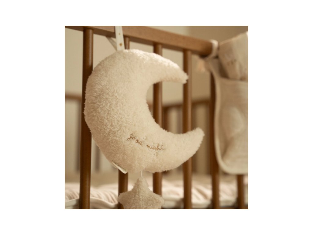 Závěsný plyšový měsíček v sobě skrývá natahovací hudební box s příjemnou ukolébavkou, která vaše miminko uklidní a pomůže mu usnout. Měsíček snadno zavěsíte poblíž postýlky.