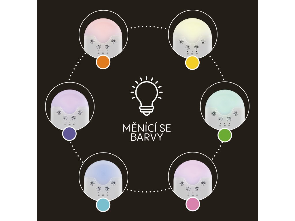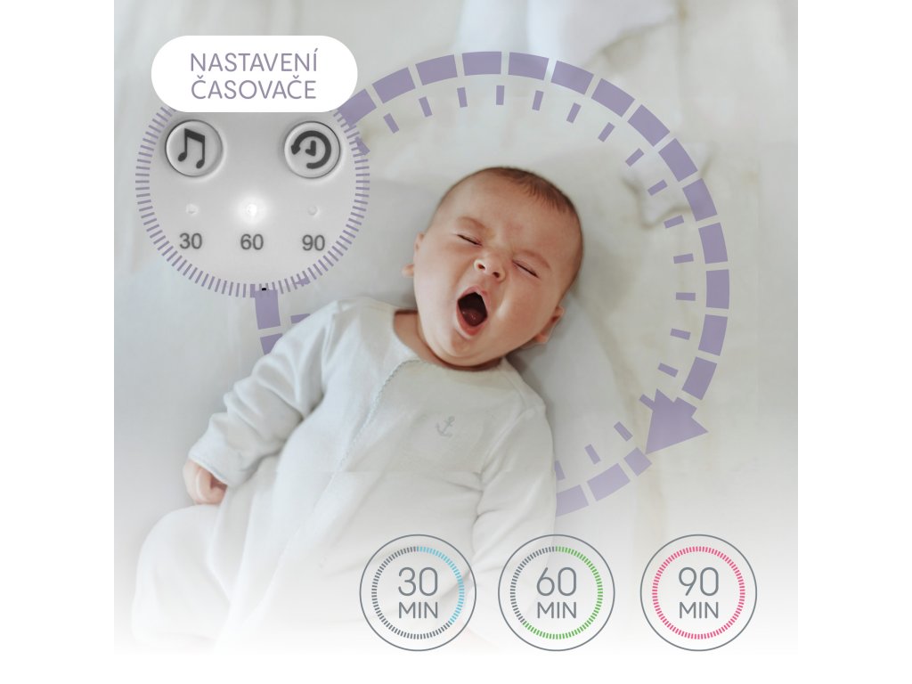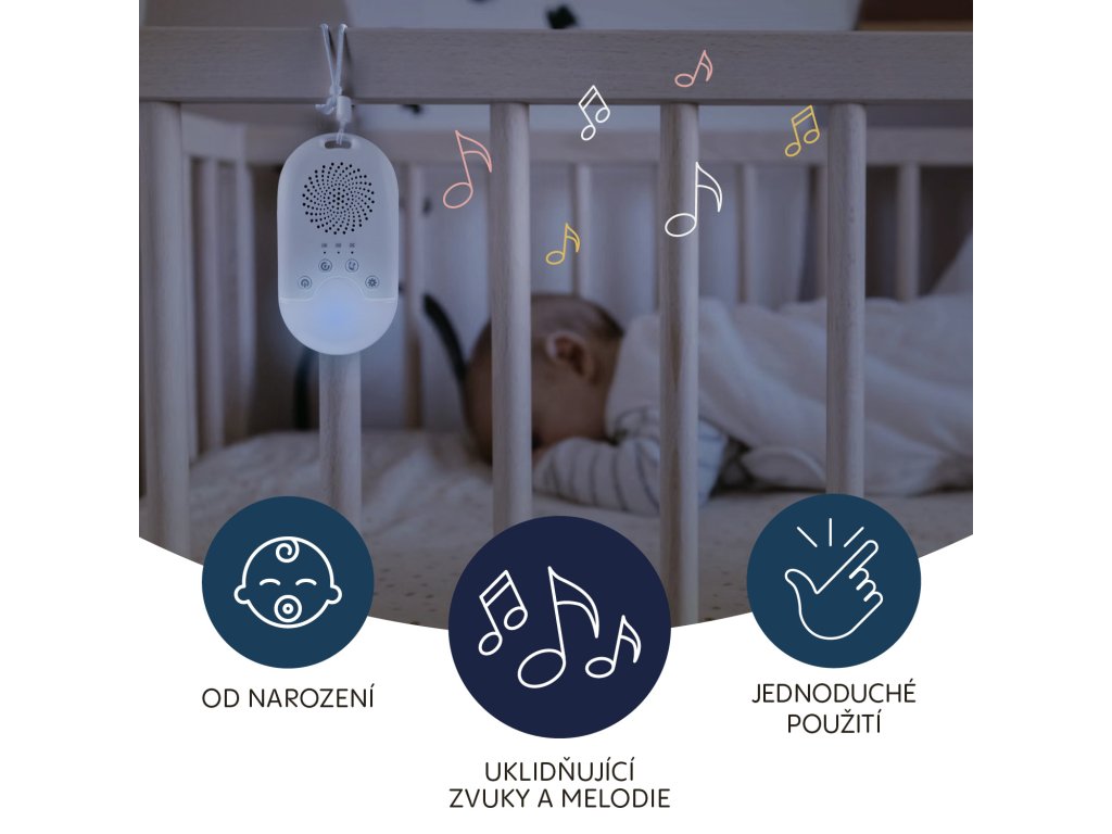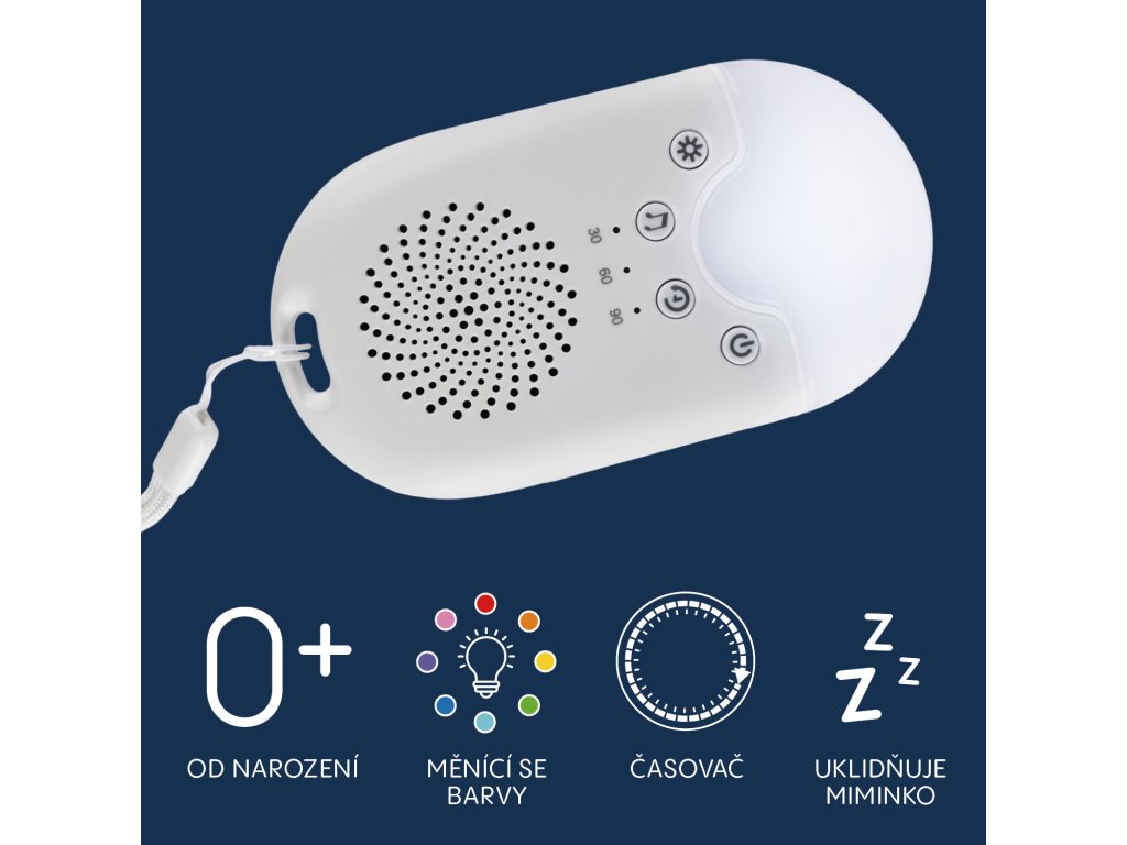 Modul je vybavený stlmiteľným bielym svetlom, ktoré jednoducho prispôsobíte aktuálnym potrebám. Pre hravejšiu atmosféru ponúka meniace sa RGB farby, ktoré môžete zastaviť na obľúbenej farbe. Okrem toho modul prehráva až 8 upokojujúcich zvukov a melódií vrátane obľúbeného bieleho šumu, ktorý pomáha dieťaťu rýchlejšie sa upokojiť a zaspať.