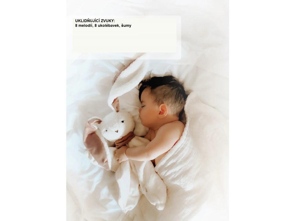 Termofor / senzor spánku / 3 šumy / 8 melódií /8 uspávaniek /vibrácie / APP /lampička 2 farby / USB nabíjanie / časovač