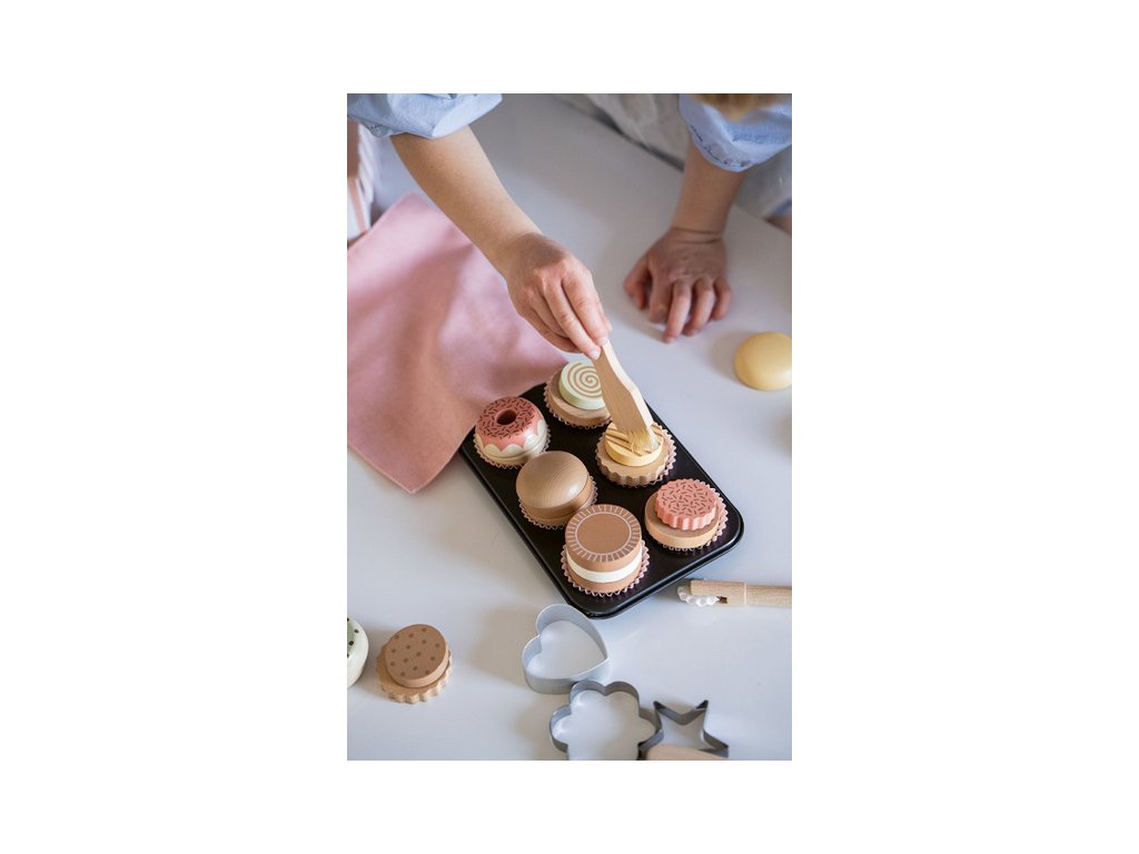 Set na pečenie Donut Nechajte deti otvoriť si vlastnú pekáreň s týmto krásnym pekárskym setom v jemných pastelových farbách. Obsahuje všetko potrebné na zábavné pečenie – formičky na muffiny, misu, stierku a roztomilé vykrajovačky, to všetko uložené v hravej taške s motívom donutov. Tento typ hračky podporuje kreatívnu hru a zároveň deti zoznamuje s kúzlom pečenia. Ideálny pre malých pekárov, ktorí chcú experimentovať vo svojej detskej kuchynke a potešiť rodinu či kamarátov vlastnými nápaditými dobrotami. Informácie o produkte: Rozmery produktu: 28 × 19 × 8,8 cm Rozmery balenia: 29 × 19,7 × 9,3 cm Materiál: preglejka, čajovníkové drevo Upozornenie: Nevhodné pre deti do 3 rokov – malé časti Bezpečnosť: Testované a certifikované podľa európskych noriem Obsah balenia: 6 ks