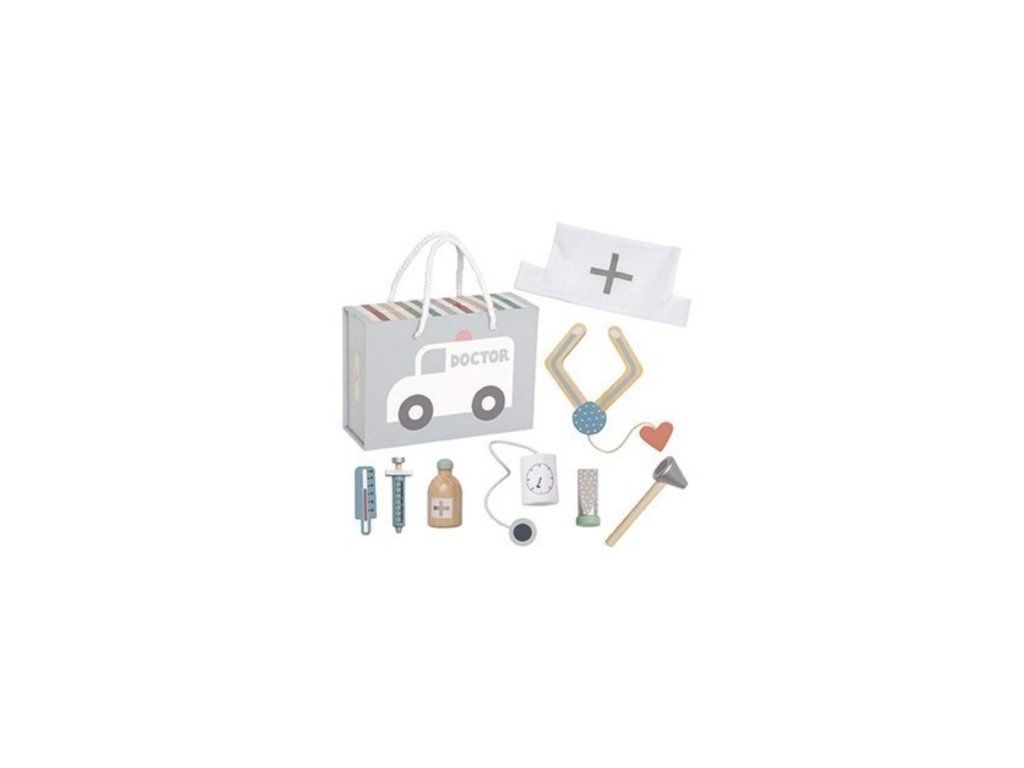 Vyrobeno z FSC™-certifikovaného dřeva (FSC™C194598) Obsah sady: 1x injekční stříkačka 1x dřevěný stetoskop 1x teploměr 1x mast 1x tlakoměr 1x lékařská čepice 1x lahvička s léky 1x otoskop (přístroj pro vyšetření očí a uší).