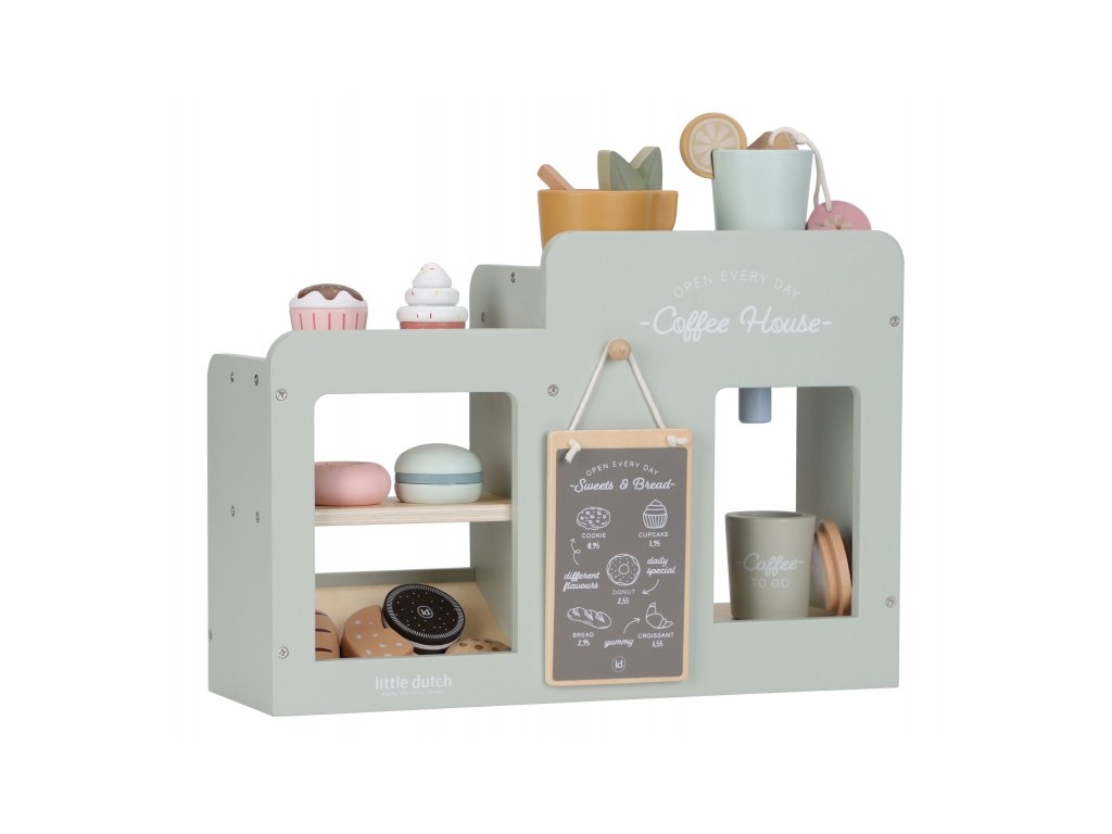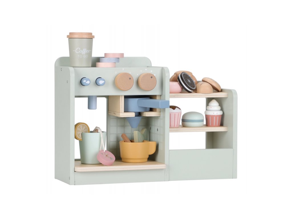 Súčasťou setu je kávovar, čajovar, úložný priestor na hrnčeky a vitrína na vystavenie sladkostí a sendvičov. Deti môžu servírovať čaj s koláčikom alebo cappuccino s tortičkami a pozvať rodinu i kamarátov do svojej vlastnej kaviarne.