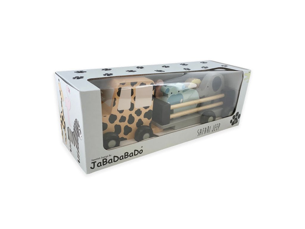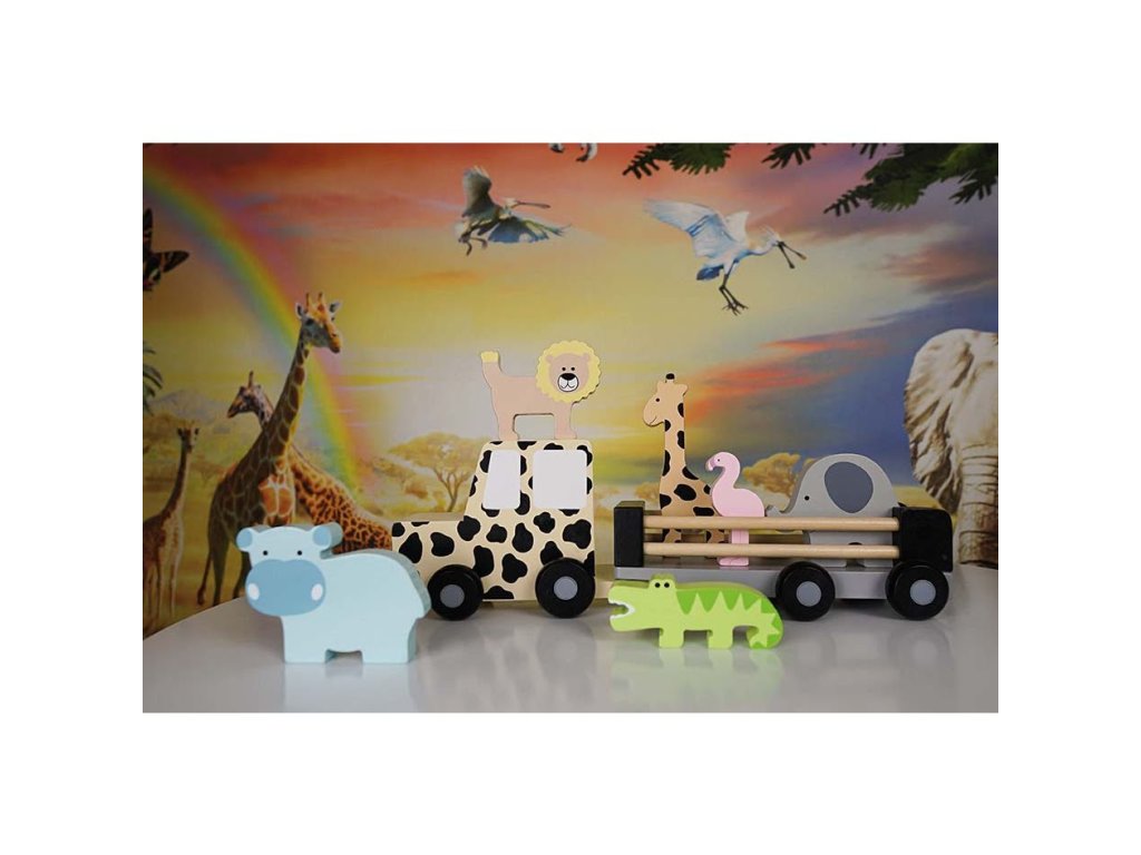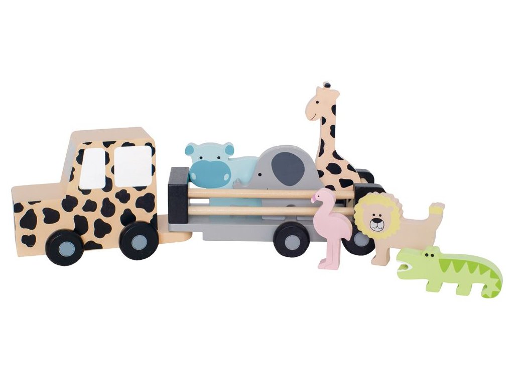 Jeep safari obsahuje: slona, žirafu, krokodíla, plameniaka, leva a hrocha. Odporúčaný vek: 18m+ Materiál: drevo, plast, kov Rozmery: 34 x 9 x 10 cm