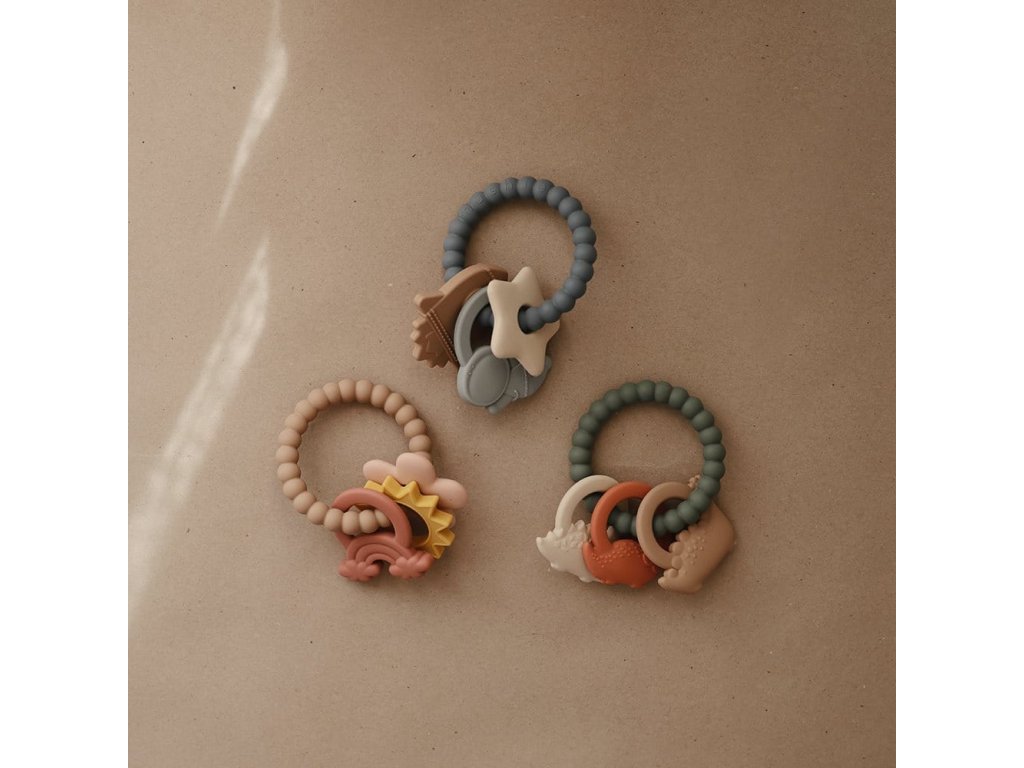 Krúžok na prerezávanie zúbkov má rôzne tvary a textúry, ktoré stimulujú zmysly detí, kým si zaboria ďasná do mäkkého 100% potravinárskeho silikónového materiálu.