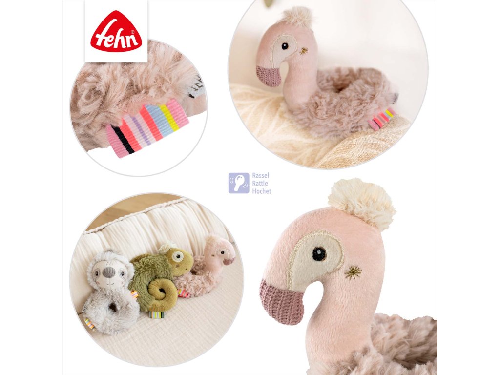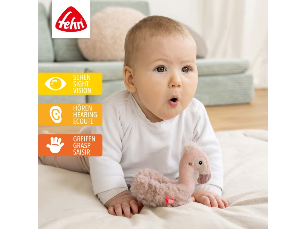 Deti milujú maznivého plameniaka a jeho jemné pierka, ktoré môžu chytať, skúmať, objavovať a mojkať sa s nimi!