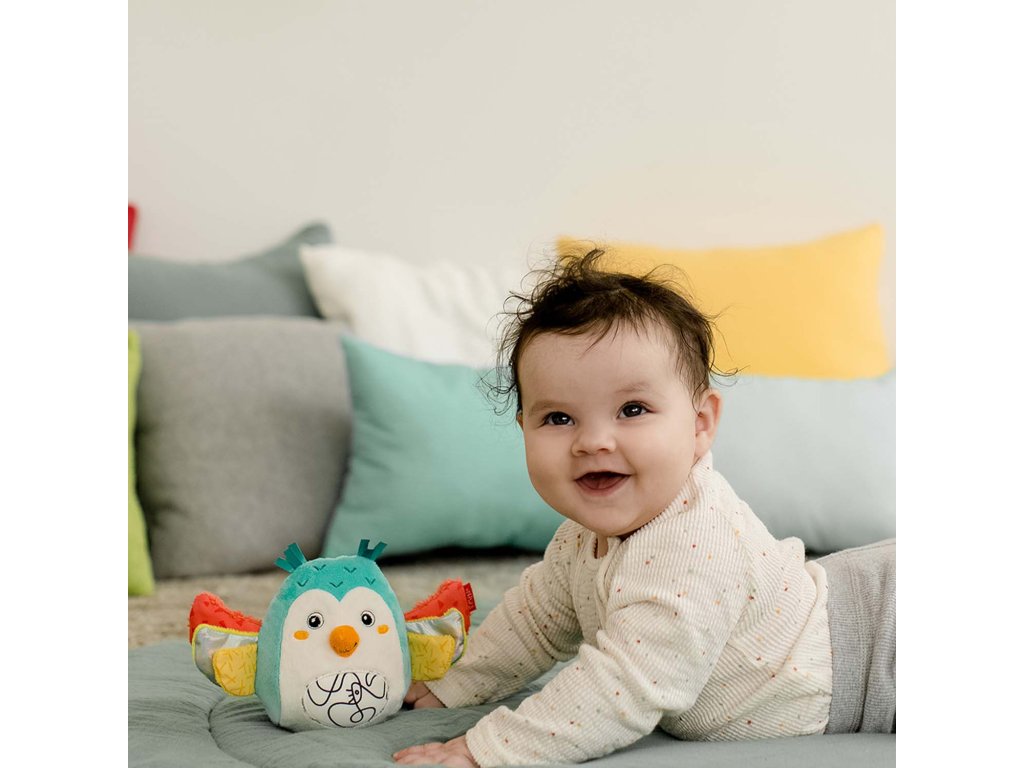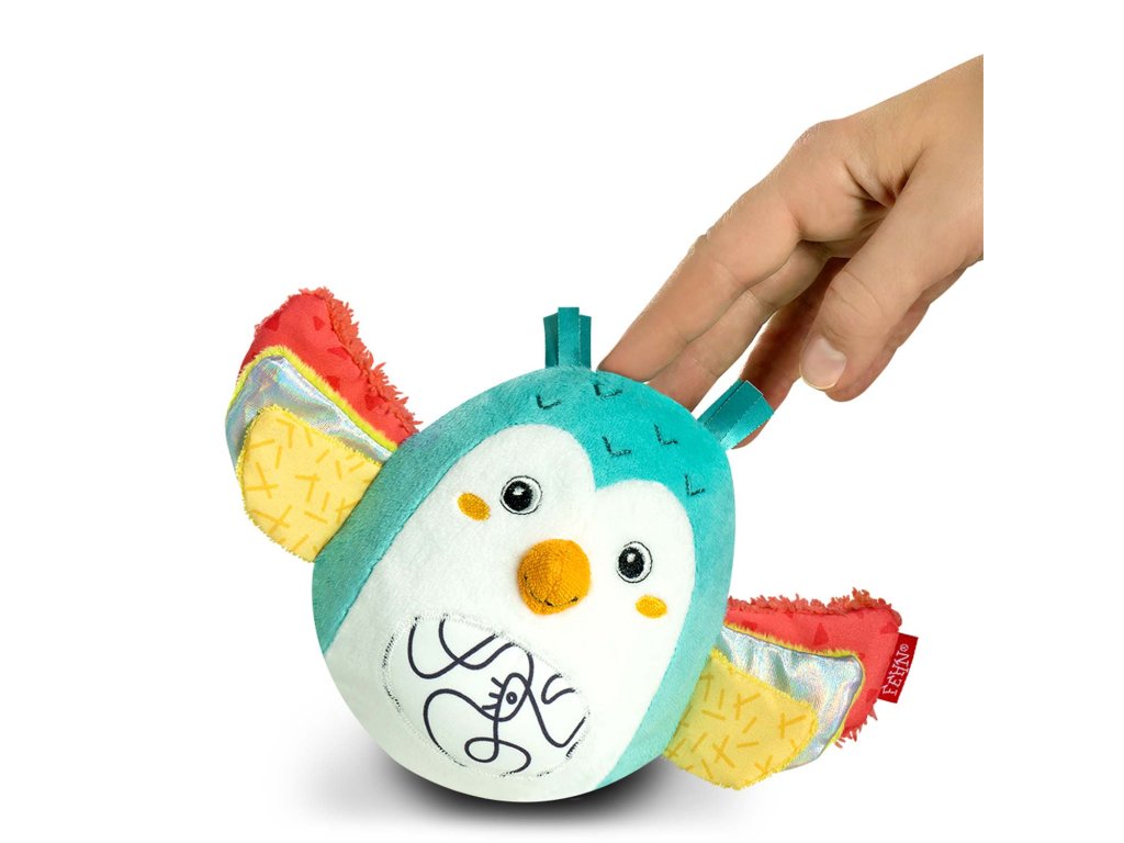Plyšová hrkálka s množstvom aktivity prvkov ako je zvonček a praskací papier. Hračka na uchopenie hravo podporuje sluch dieťaťa, zmysel pre zrak, hmat, zdravé uchopenie a logické myslenie – ideálny ako darček pre chlapcov a dievčatá.