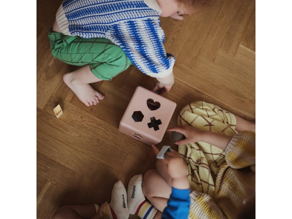 Hračka Mushie Shape Sorting Box pomáha deťom od 10 mesiacov hravo spoznávať tvary, rozvíja koordináciu a sústredenie.