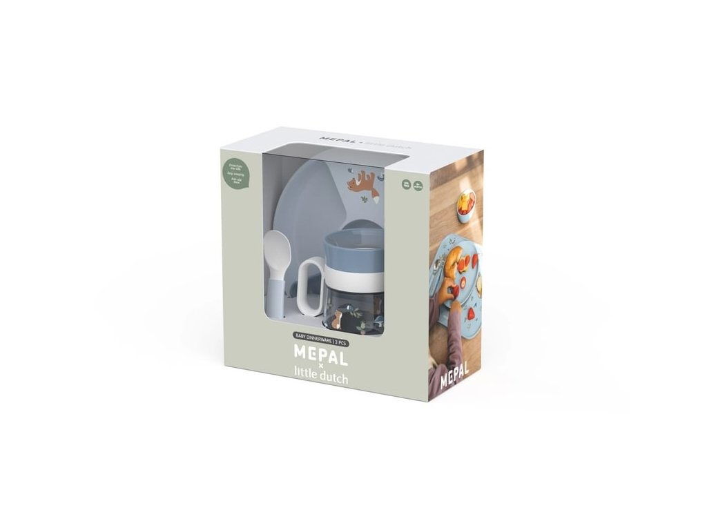 3-dielna jedálenská súprava v krásnom dizajne s jemnou potlačou obsahuje detský delený tanier, trénovací hrnček so systémom 360 ° a lyžičku.