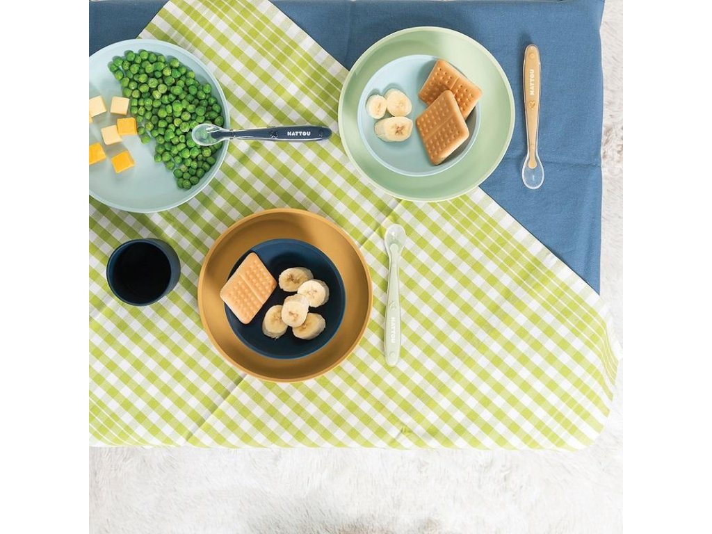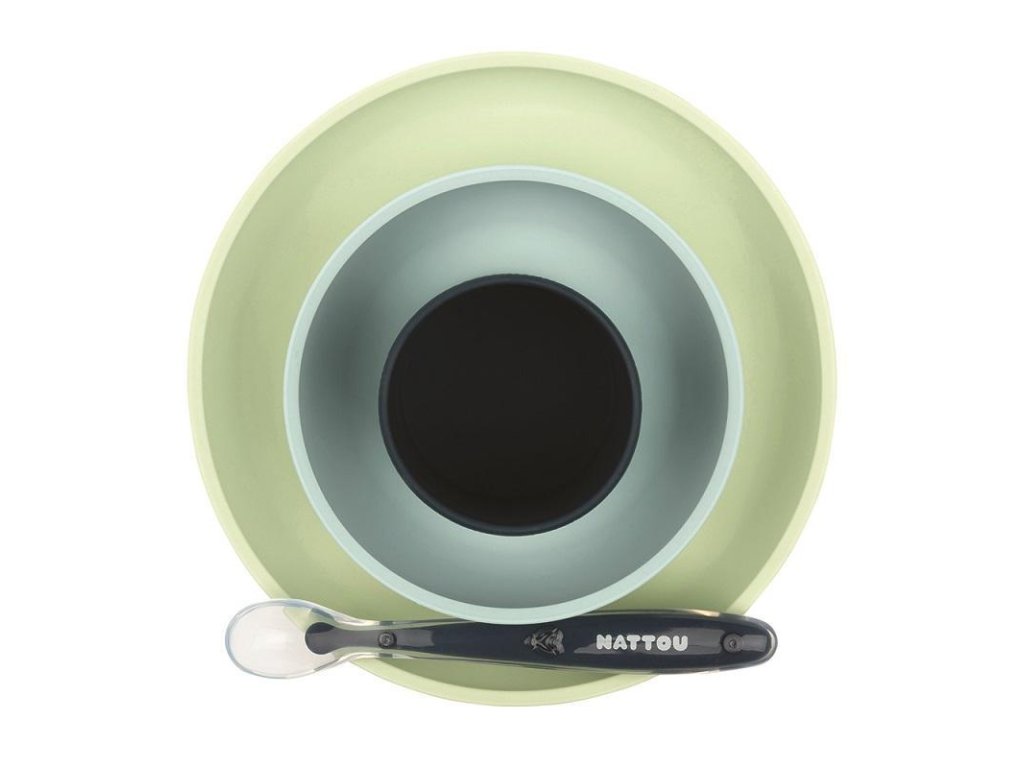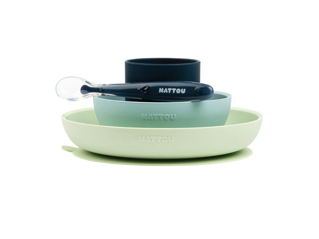 Štvordielny jedálenský set od Nattou z mäkkého silikónu je veľmi praktický, ľahko uchopiteľný a protišmykový. Set obsahuje tanierik a misku s prísavkou, hrnček a lyžičku. Zaoblené vnútorné hrany misky a tanierika uľahčujú naberanie potravín detičkám a ich rodičom.