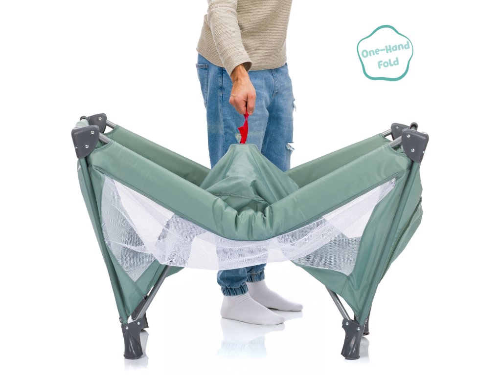 Skutečným highlightem je inovativní systém skládání jednou rukou – na rozdíl od běžných cestovních postýlek, které vyžadují skládání z více stran najednou, se Valencia složí jediným pohybem. Stačí zatáhnout za poutko uprostřed a postýlka se snadno složí či rozloží. Rychle, bez námahy, a dokonce i s miminkem v náručí. Stavění a skládání cestovní postýlky nikdy nebylo tak snadné!