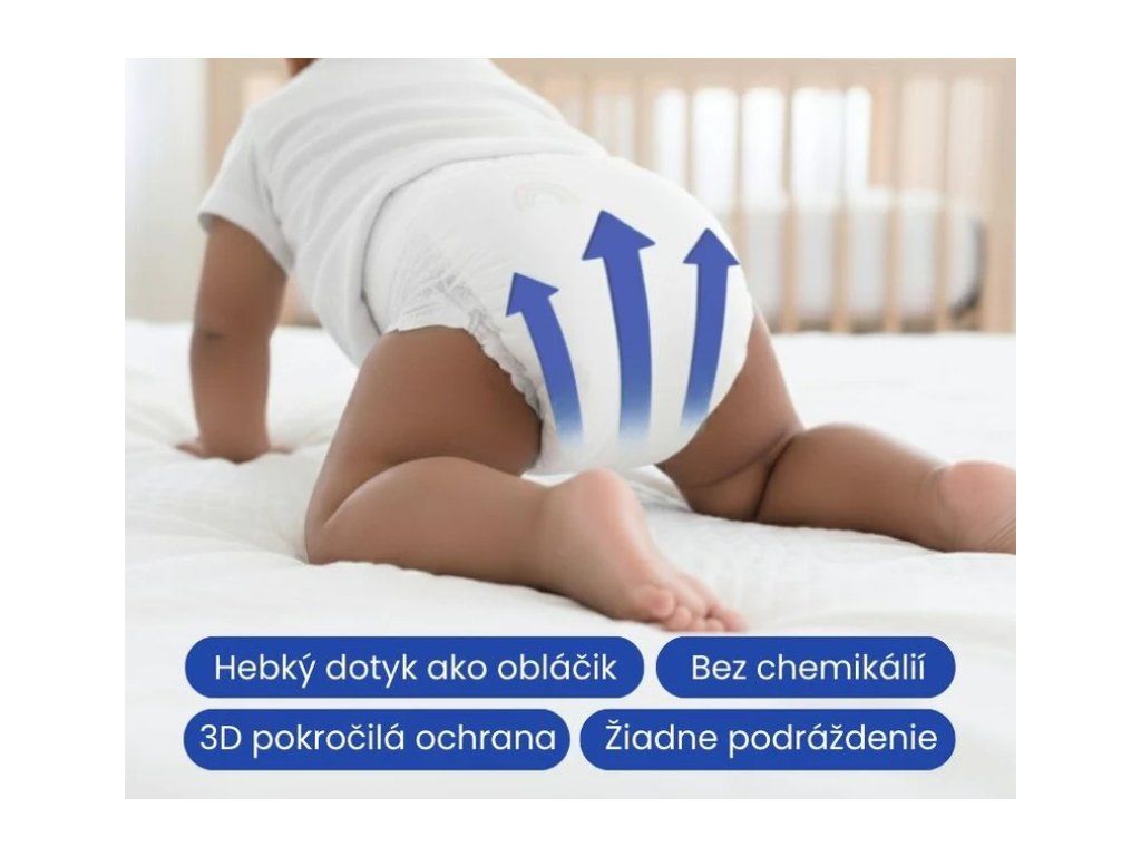 Plienky sú vyrobené z ultra jemných, netoxických materiálov s pokročilou 3D absorpčnou technológiou, ktoré pomáhajú udržať bábätko v suchu, pohodlí a bezpečí počas dňa aj noci.