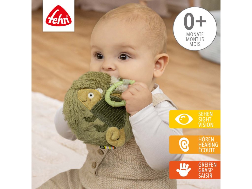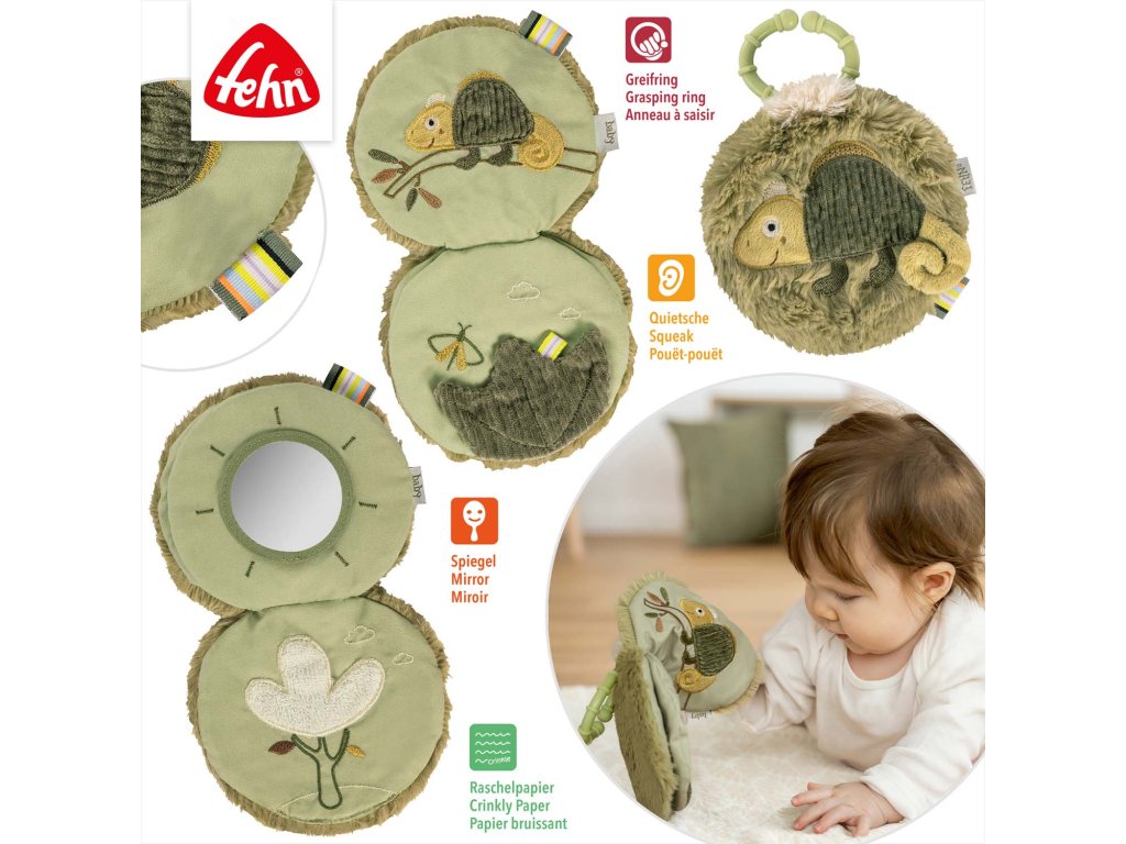 Mäkká kniha Chameleón z kolekcie Lazy, Crazy & Pink láka deti na skúmanie, objavovanie a ohmatávanie. Pískatko, šuštiaci papier, zrkadielko a pestrá kombinácia materiálov vyčarí na tvári dieťaťa úsmev a údiv a zároveň podporuje prvé pokusy o uchopenie, rozvoj hmatu a pozitívne vnímanie seba samého.