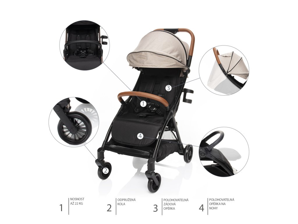 Lehká konstrukce, polohovatelná zádová opěrka, polohovatelná opěrka na nožičky, prodloužitelná stříška s okýnkem, 5bodový pás s magnetickou sponou, nášlapná brzda, odpružená kola, odklápěcí hrazda, složení jednou rukou – to je kočárek Quiq.