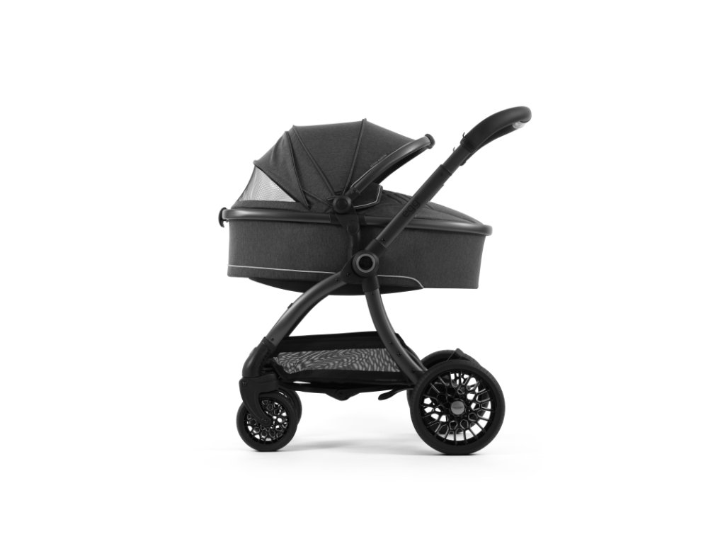 Matný šedý podvozok kočíka Aston Martin egg3® Classic Grey dopĺňa elegantne prepracovaný, strieborný ryhovaný stredový kĺb, inšpirovaný ikonickými otočnými ovládacími prvkami interiérov vozidiel Aston Martin. Tento detail dodáva kočíku nádych autentickej automobilovej precíznosti. Kolesá s voštinovou štruktúrou, inšpirované modelmi Aston Martin Valour a Victor, sa dokonale snúbia s technológiou Tru-Ride®, ktorá prináša plynulú, tichú a sebaistú jazdu na každom povrchu. Celkové odpruženie, voliteľne otočné či aretovateľné predné kolesá a veľkorysý úložný košík zaisťujú praktickosť a komfort pre každodenné použitie.