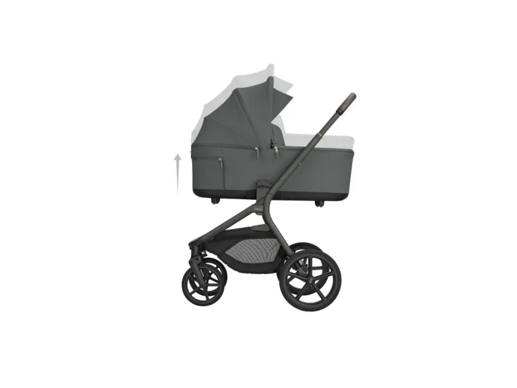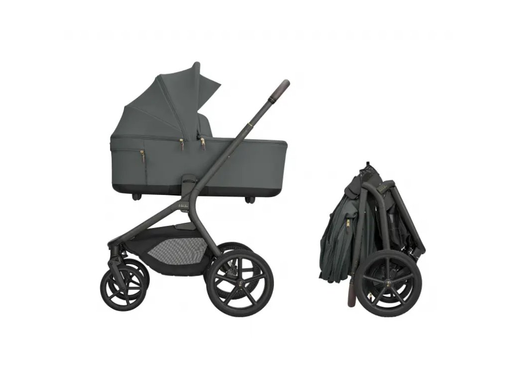 Po zložení kočík samostatne stojí. Pre ľahké prenášanie je pripravený popruh cez rameno a madlo.