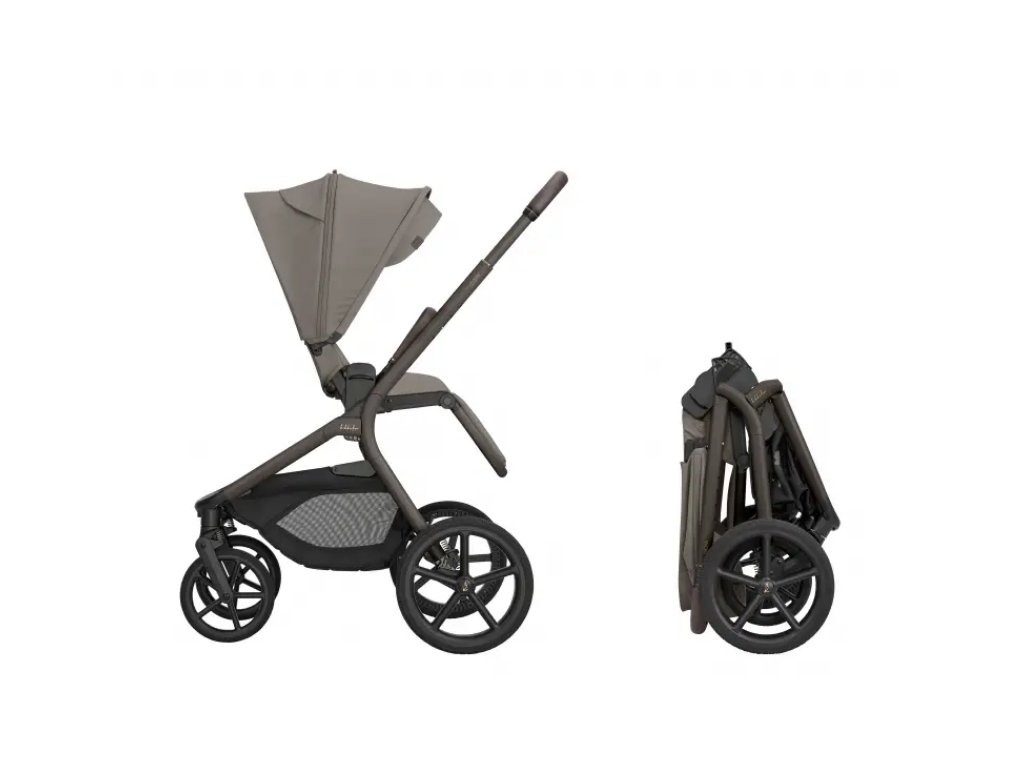 Po zložení kočík samostatne stojí. Pre ľahké prenášanie je pripravený popruh cez rameno a madlo.