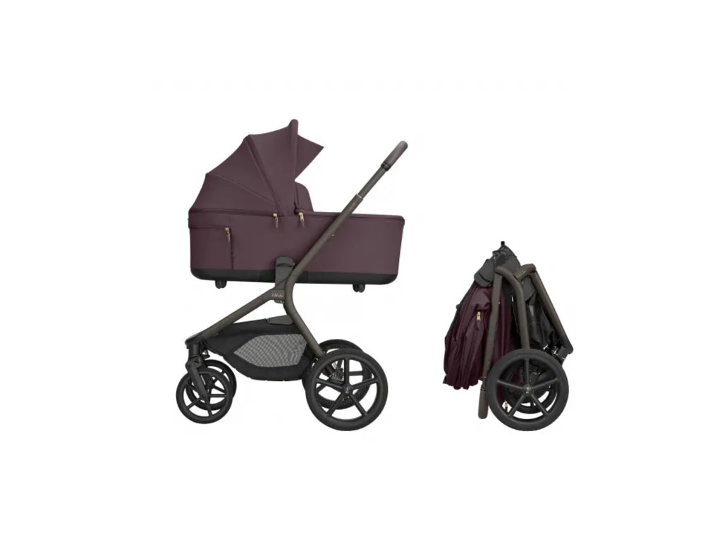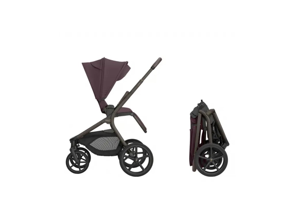 Po zložení kočík samostatne stojí. Pre ľahké prenášanie je pripravený popruh cez rameno a madlo.