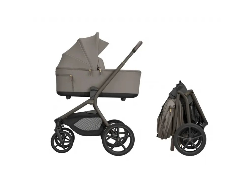 Po zložení kočík samostatne stojí. Pre ľahké prenášanie je pripravený popruh cez rameno a madlo.