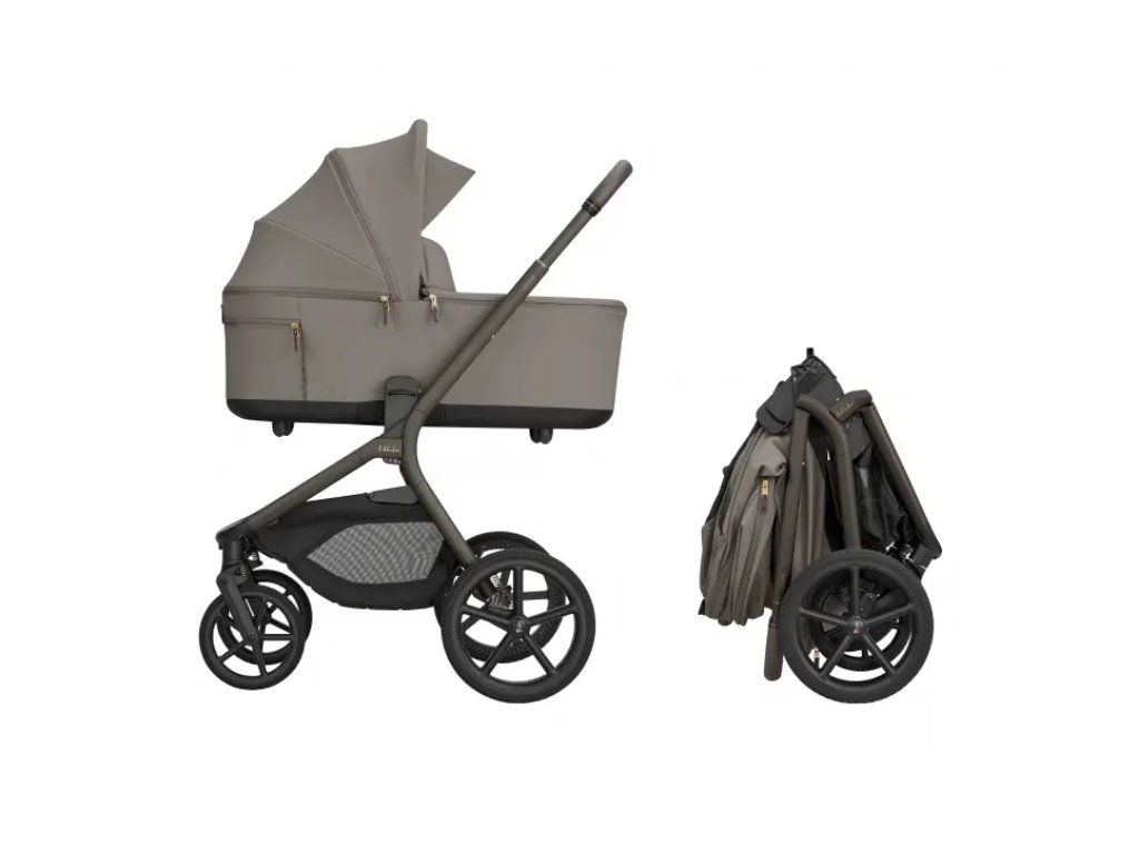 Po zložení kočík samostatne stojí. Pre ľahké prenášanie je pripravený popruh cez rameno a madlo.