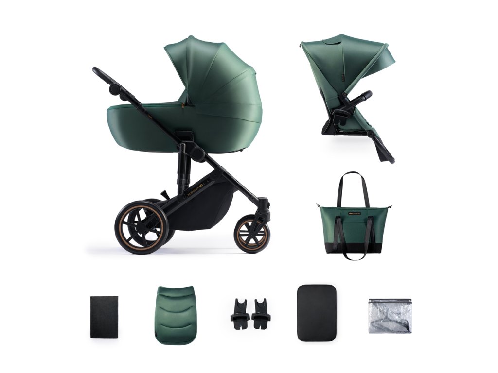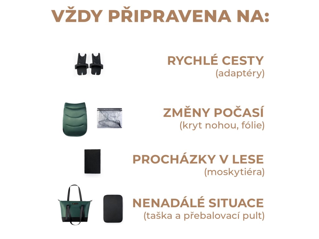 Príslušenstvo: taška s prebaľovacou podložkou, pláštenka, nánožník, moskytiéra, matrac do vaničky, autosedačka a univerzálne adaptéry
