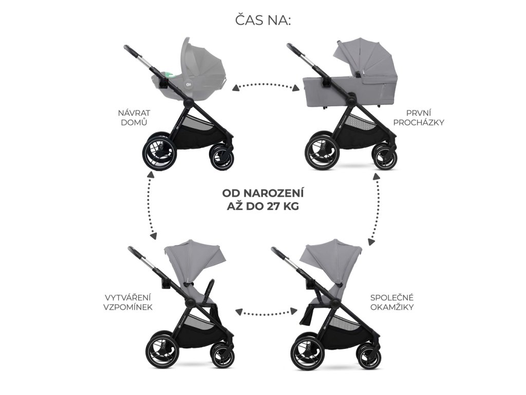 - Od narodenia do 22 kg – kočík má veľkú vaničku s mäkkým matracom, ktorú môže dieťa používať do 9 kg alebo do chvíle, keď sa začne prevracať. Sedadlo kočíka je možné namontovať smerom dopredu alebo dozadu voči smeru jazdy.