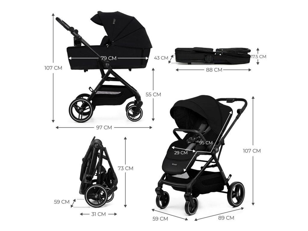 - Rozložený kočík (športová sedačka): 107 x 89 x 59 cm