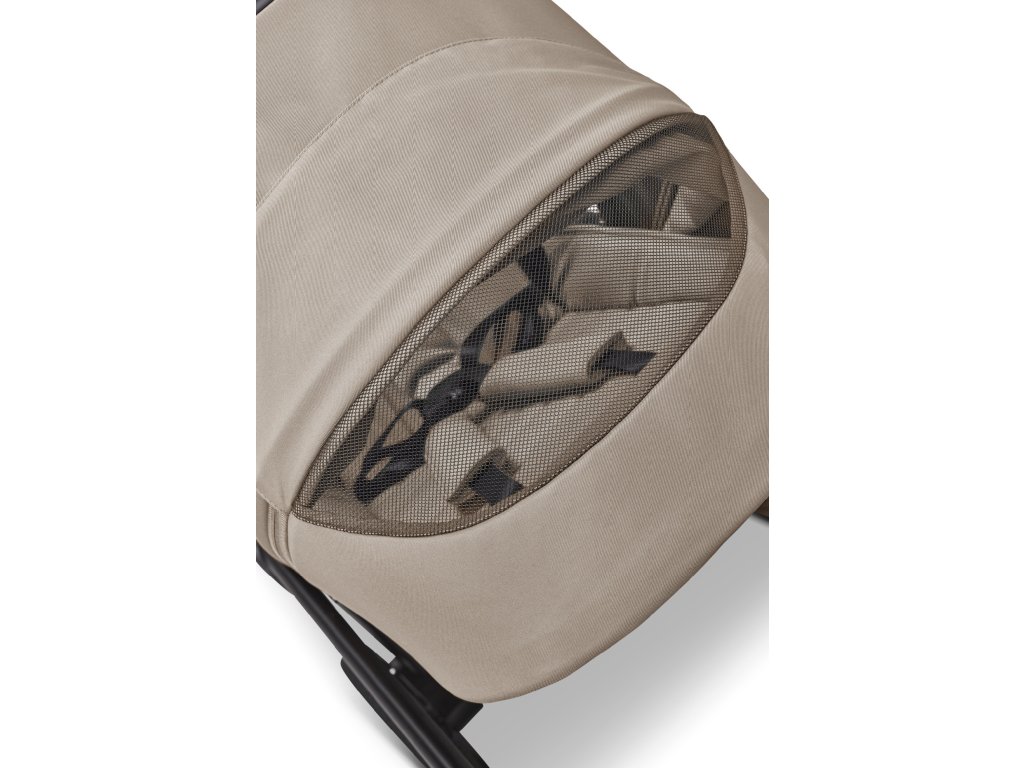 Špeciálna vnútorná vložka zabezpečuje správnu polohu dieťaťa, zatiaľ čo poťah s vysokým podielom bavlny zlepšuje cirkuláciu vzduchu a zvyšuje pohodlie počas jazdy. Nezávislá strieška chráni dieťa pred slnečným žiarením a ďalšími vonkajšími vplyvmi.