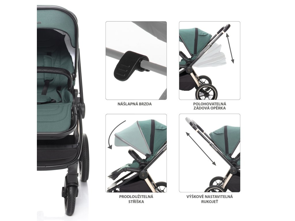 výškovo nastaviteľnou strieškou pomáha kočíku adaptovať sa rastu