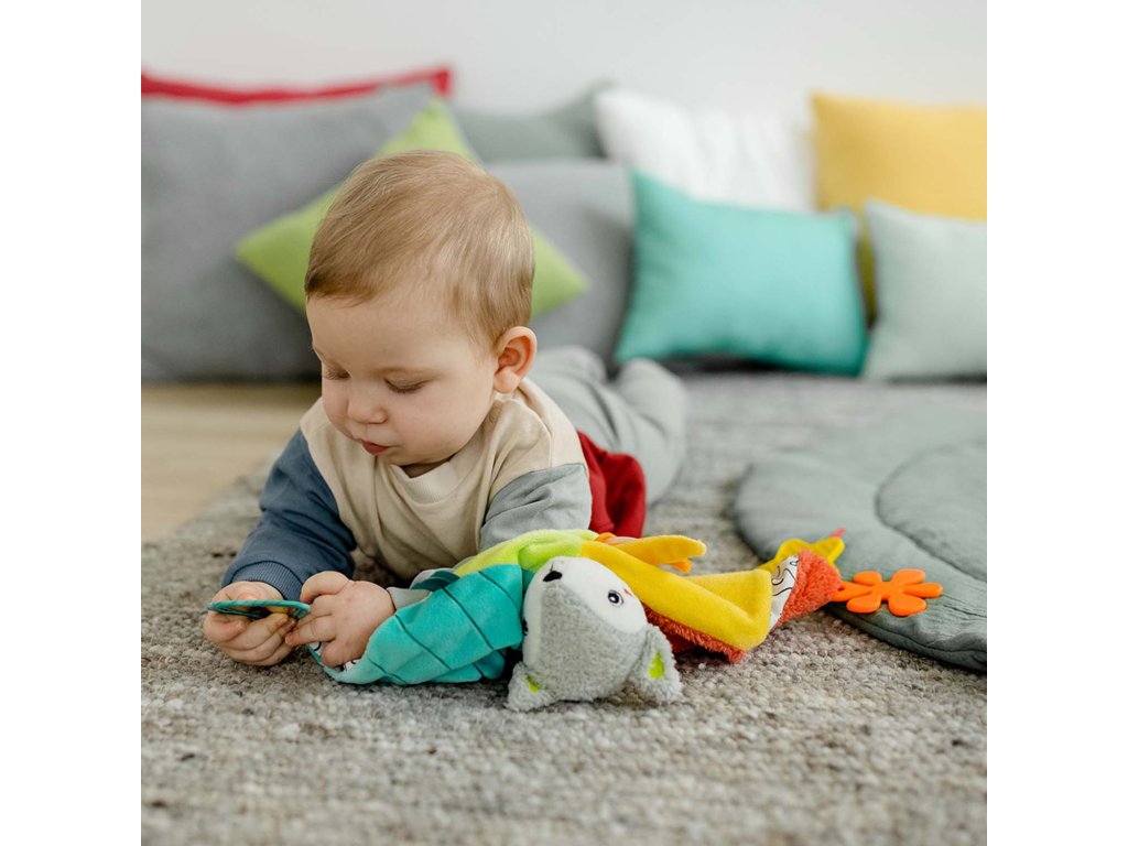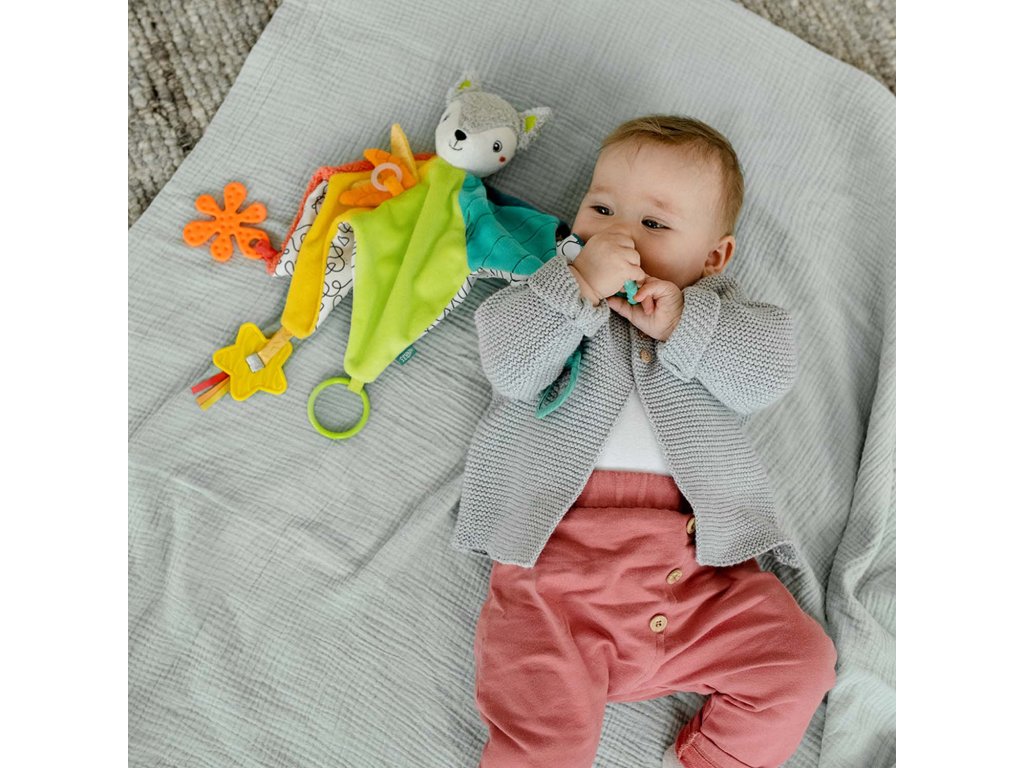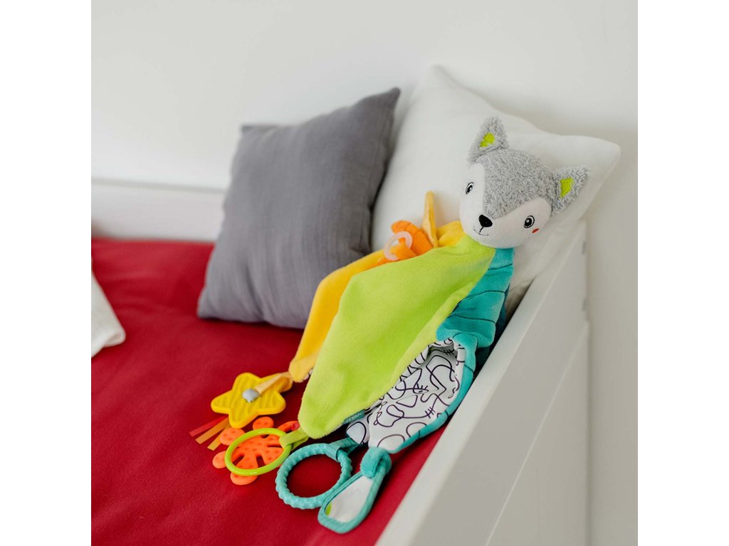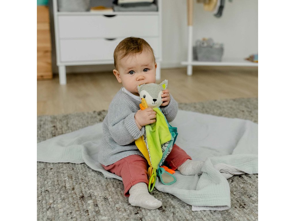 Veľa úchopových prvkov, mäkké materiály a hlavička líšky sú prvky, ktoré stimulujú zmysly bábätka a tým sa dieťatku rozvíja hmat a úchop. Praktický krúžok na cumlík zaistí, že sa cumlík nestratí pri žiadnom dobrodružstve. Dve mäkké hryzátka v neónovo oranžovej a žltej farbe pomáhajú s prerezávaním zúbkov.