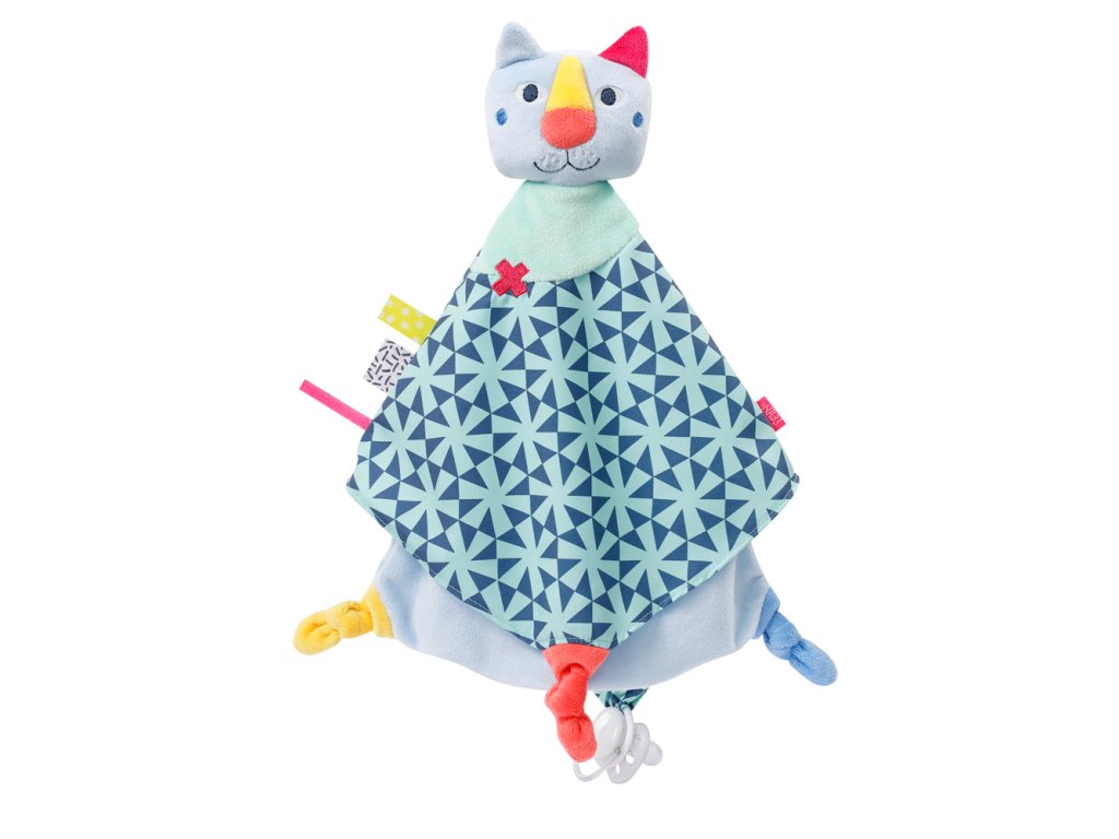 Pri zaspaní poskytuje sladká plyšová mačička pohodlie – hlavička a zauzlené konce vyzývajú dieťa na uchopenie, cítenie a objatie.