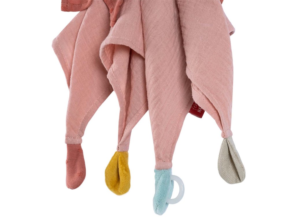Veľa úchopových prvkov, mäkké materiály a hlavička medvedíka sú prvky, ktoré stimulujú zmysly bábätka a tým sa dieťatku rozvíjajú hmatové zmysly. Praktický krúžok na cumlík zaistí, že sa cumlík nestratí pri žiadnom dobrodružstve.
