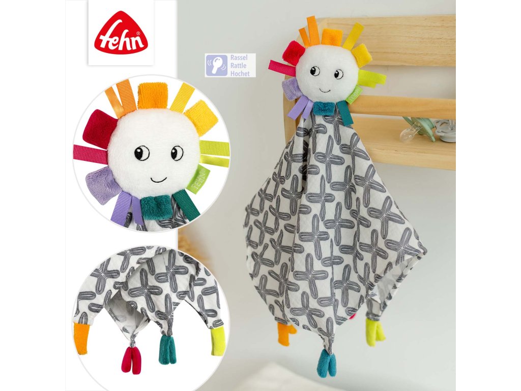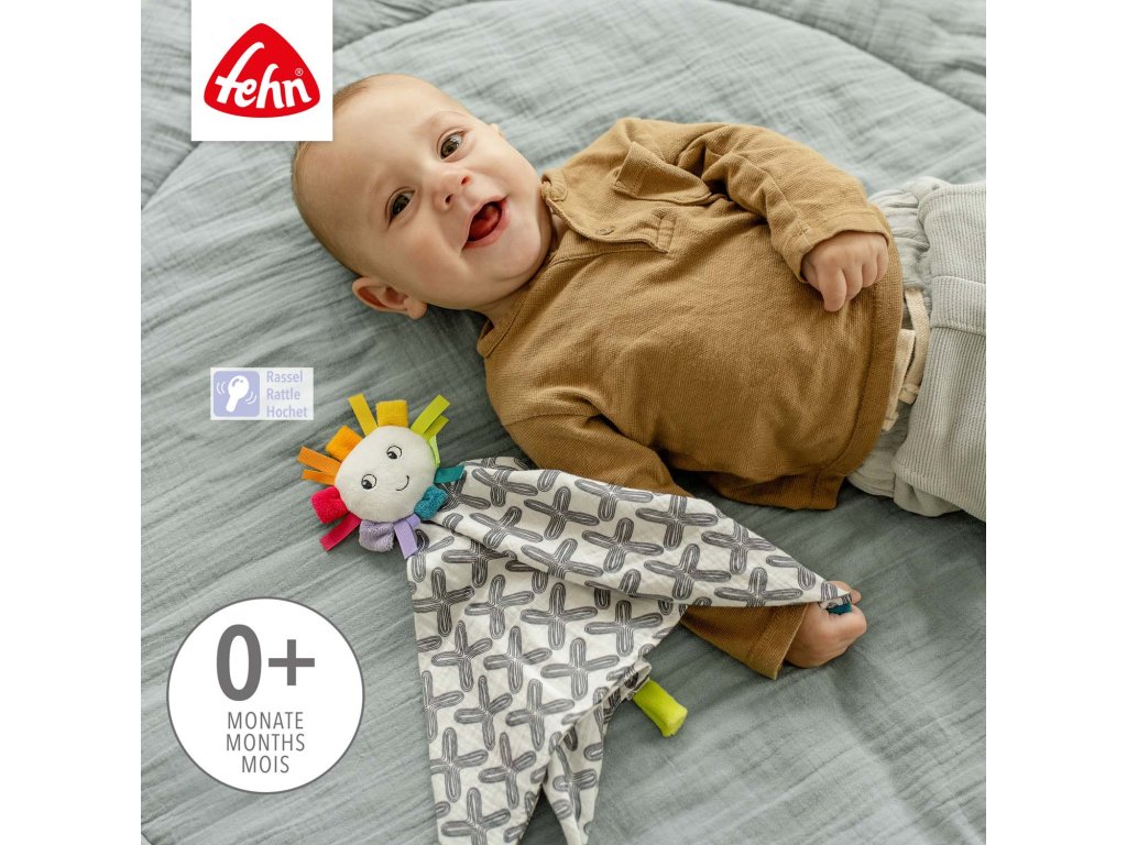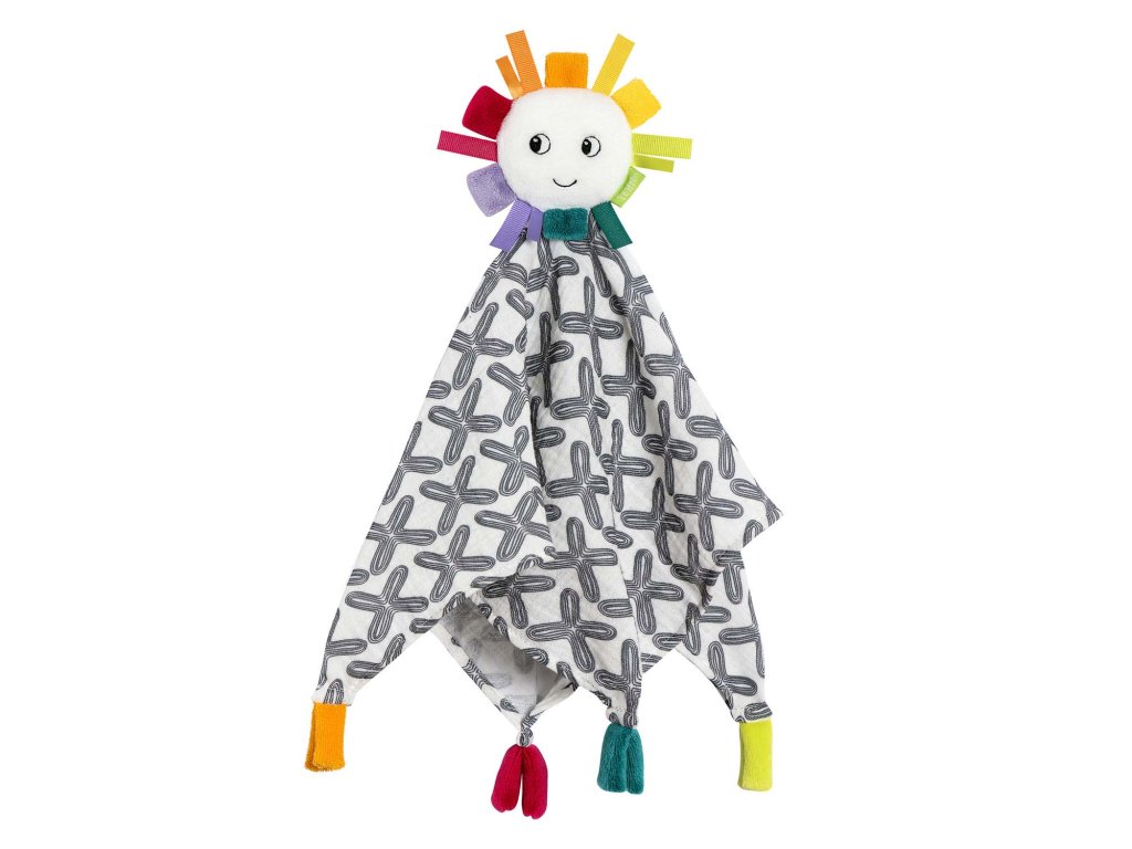 Kamarát na hranie, pomocník pri zaspávaní a maznáčik z mušelínovej bavlny s roztomilou postavičkou a hrkálkou – na maznanie, uchopenie a lásku – pre bábätká a malé deti od narodenia.