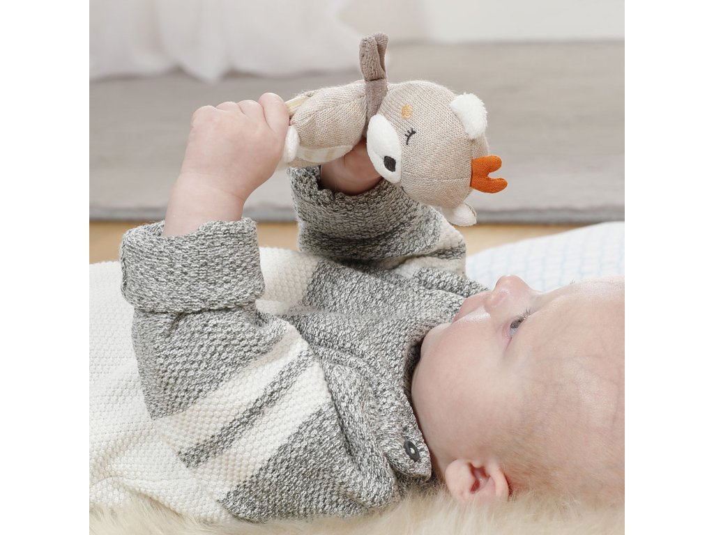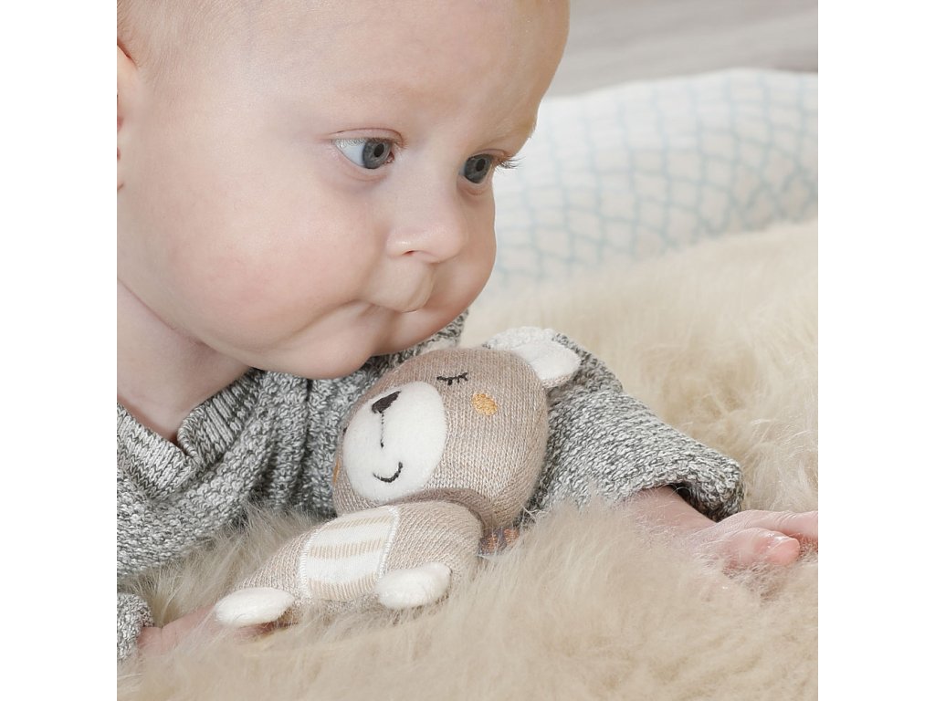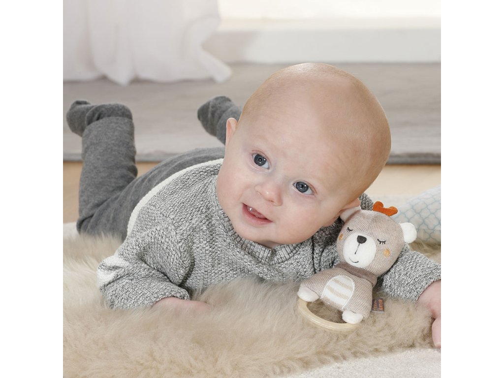 Mäkký plyšový medvedík je vyrobený z organickej bavlny a ideálny na uchopenie a maznanie. Špeciálne drevené madlo umožňuje plyšáka ľahko uchopiť a prebúdza v deťoch túžbu objavovať a hrať sa. Hrkálka podporuje hmat, sluch a motorické zručnosti dieťaťa.
