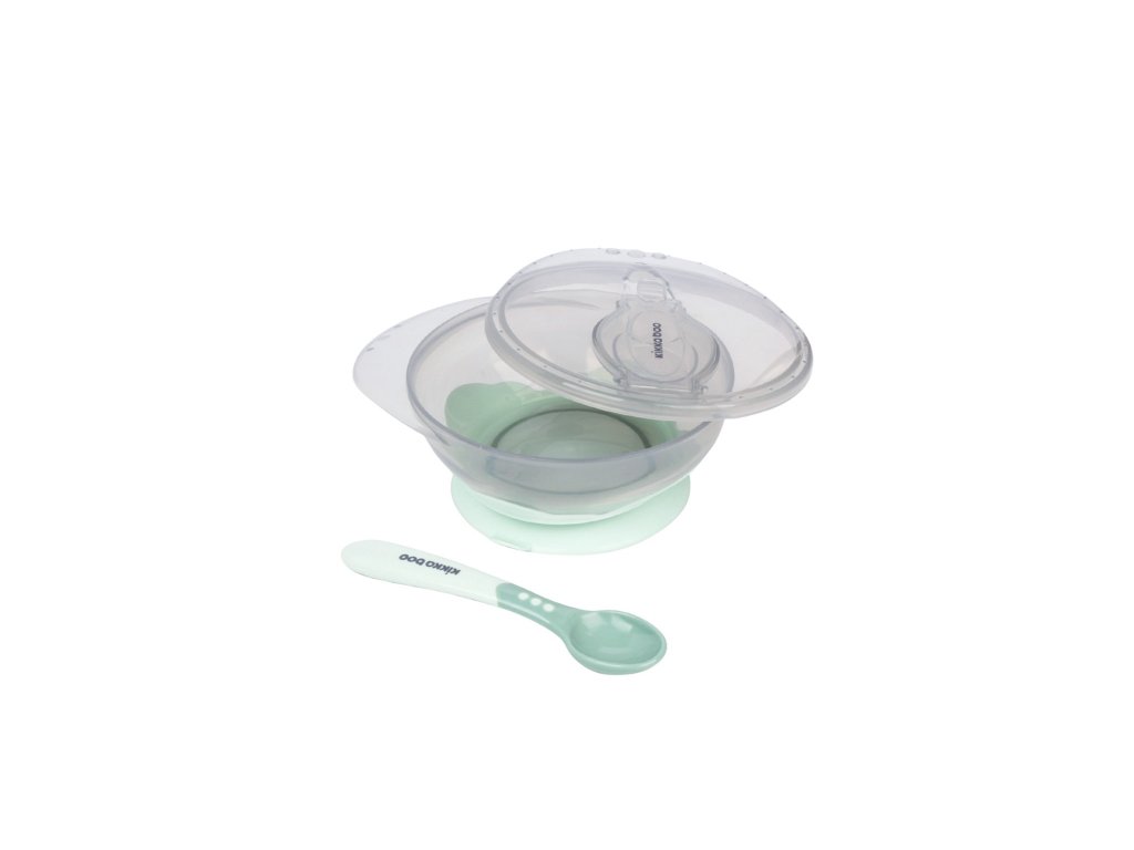 Dětská miska KikkaBoo obsahuje misku s přísavkou, lžičku a víčko. Díky přísavce miska neklouže po stole či jídelním pultu. Víčko se snadno otevírá a umožňuje praktické uložení lžičky.