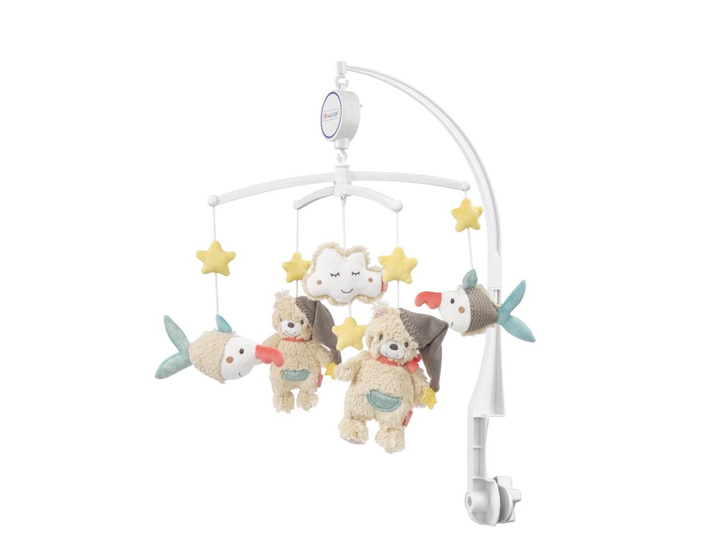 Očarujúce hudobný kolotoč z kolekcie Bruno zaboduje u každého dieťaťa. Na kolotoči nájdete medvedíkmi, rybičky, mráčik aj hviezdičky veselých a príjemných farieb. Mechanizmus so spínačom zapínanie / vypínanie sa rýchlo otáča a v príjemnej hlasitosti hrá jemné melódie. Deti sa rýchlo zabavia, kolotoč upúta ich pozornosť a následne ich ukolíbá k spánku. Kolotoč sa ľahko ovláda aj pripevňuje nad postieľku