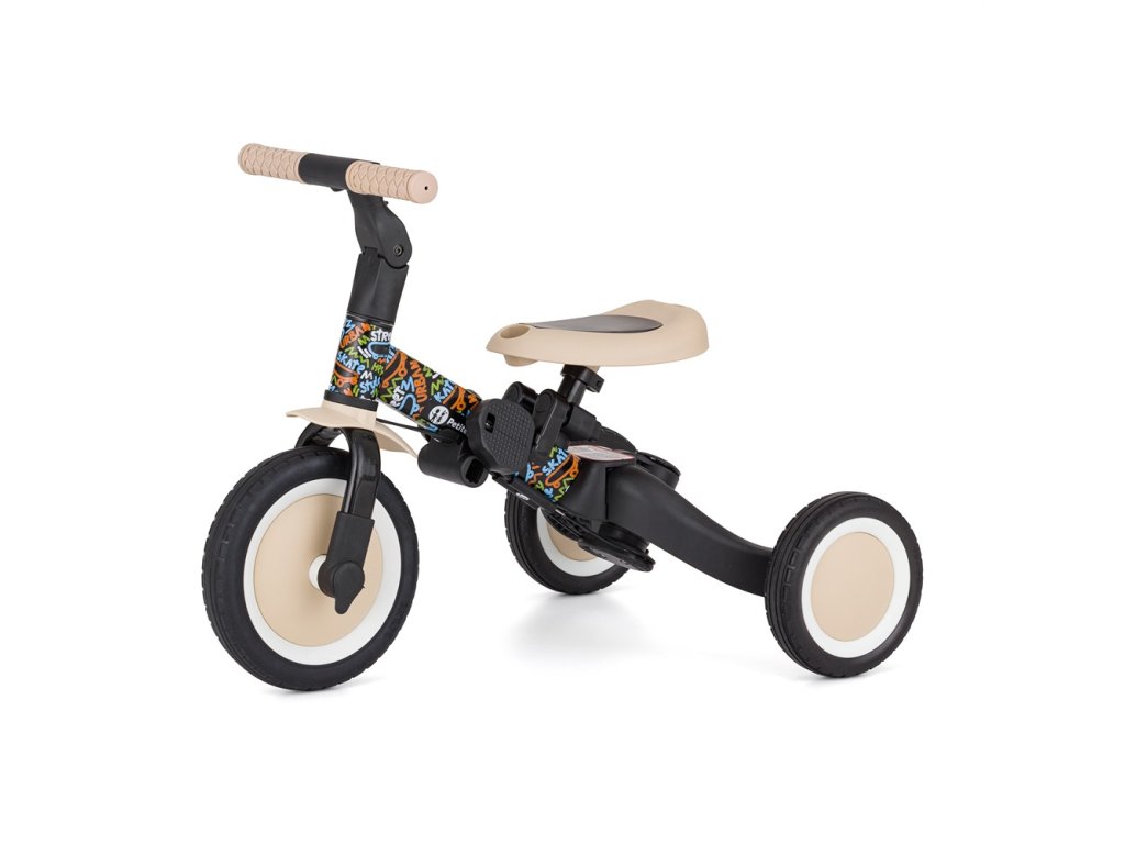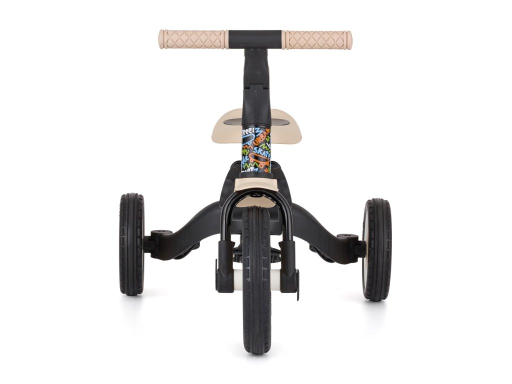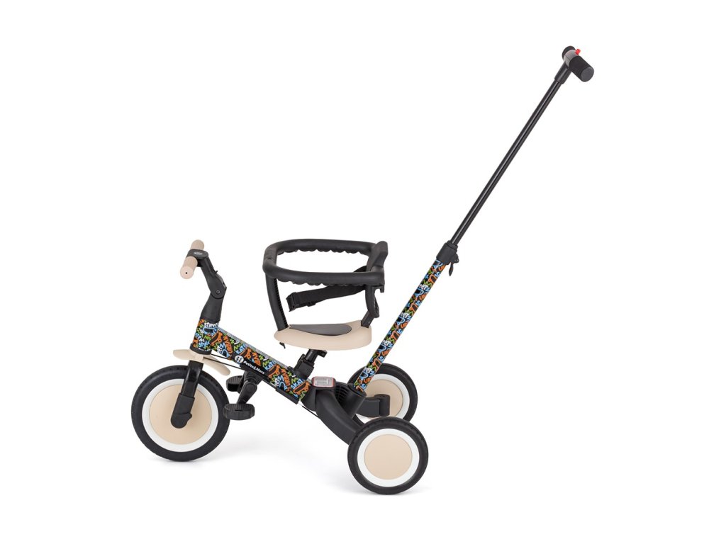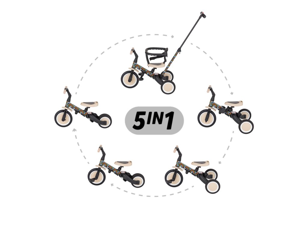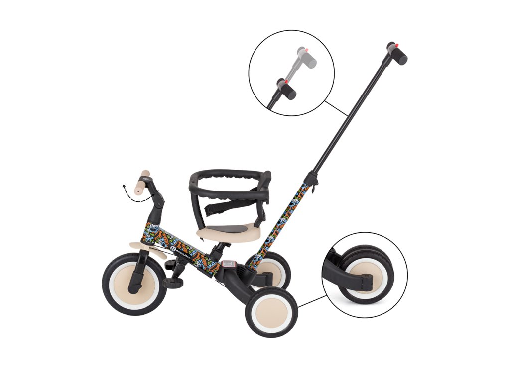 Multifunkčná trojkolka určená pre deti od 1,5 do 5 rokov alebo do 25 kilogramov je nielen dopravný prostriedok na presun a učenie sa rovnováhy, ale aj spoločník pre rastúce dieťa počas mnohých vývojových fáz. Vďaka premyslenej transformácii sa prispôsobí aktuálnym motorickým schopnostiam dieťatka – od trojkolky s asistenciou rodiča až po plnohodnotný bicykel s pedálmi.