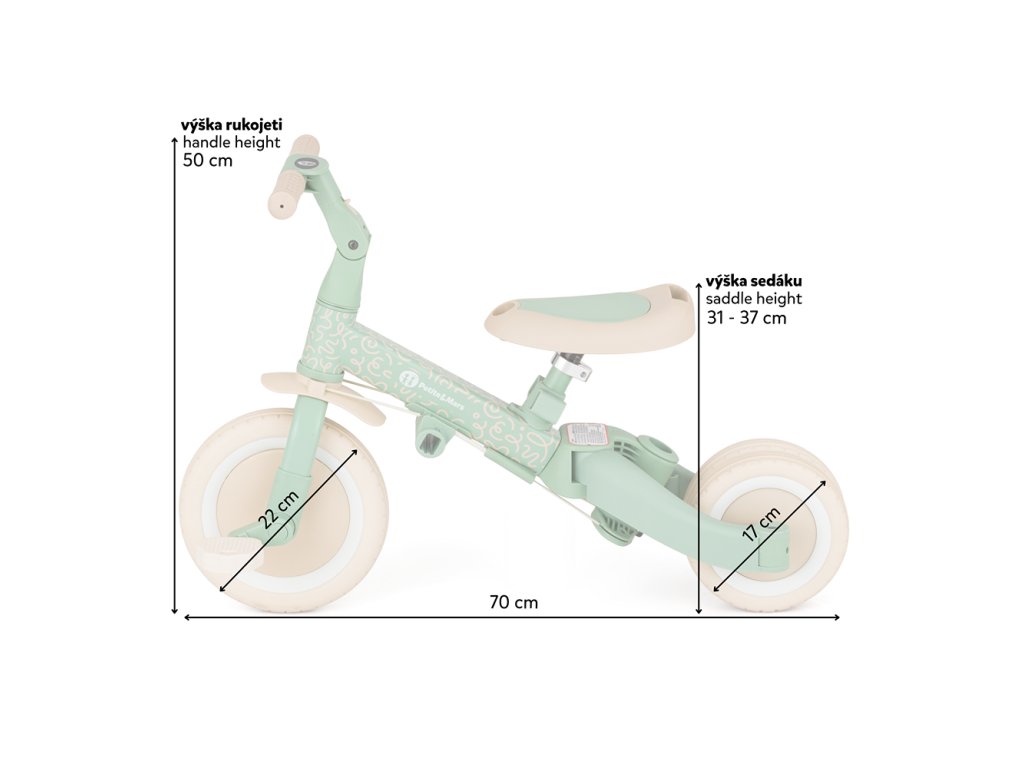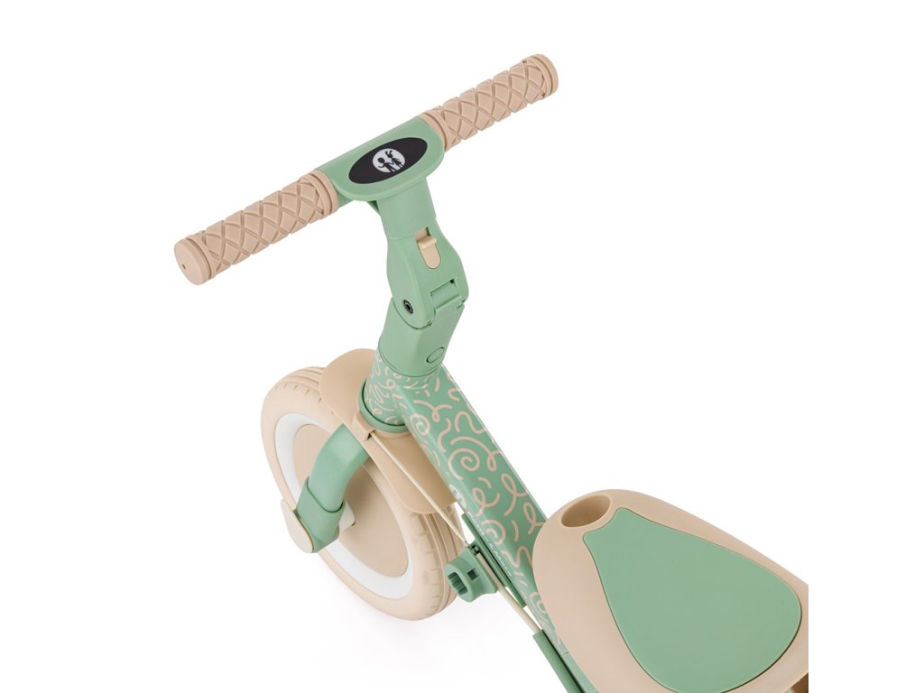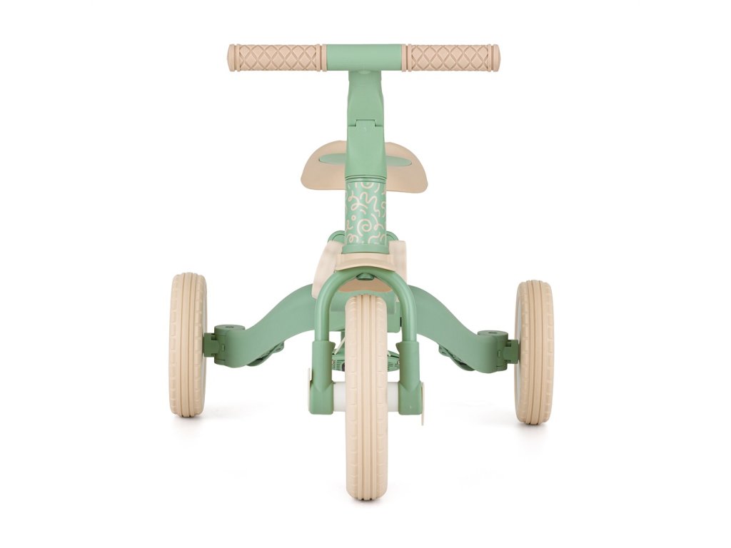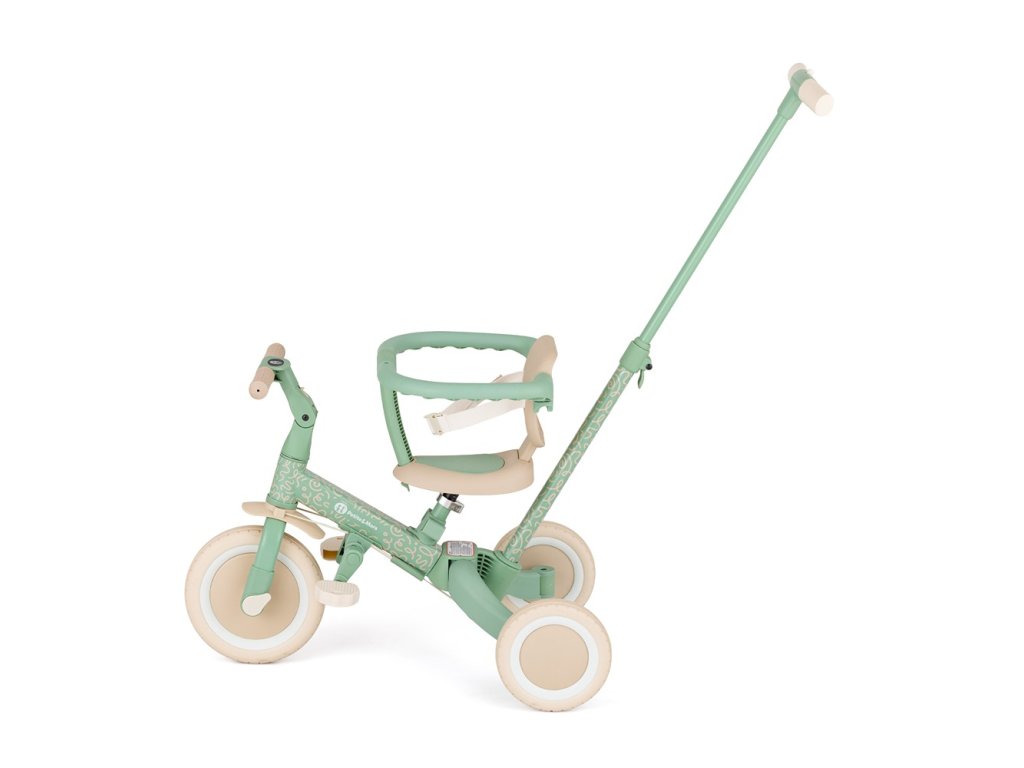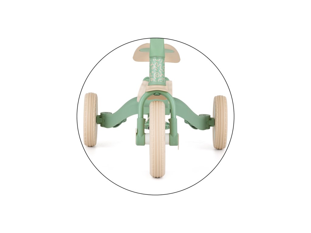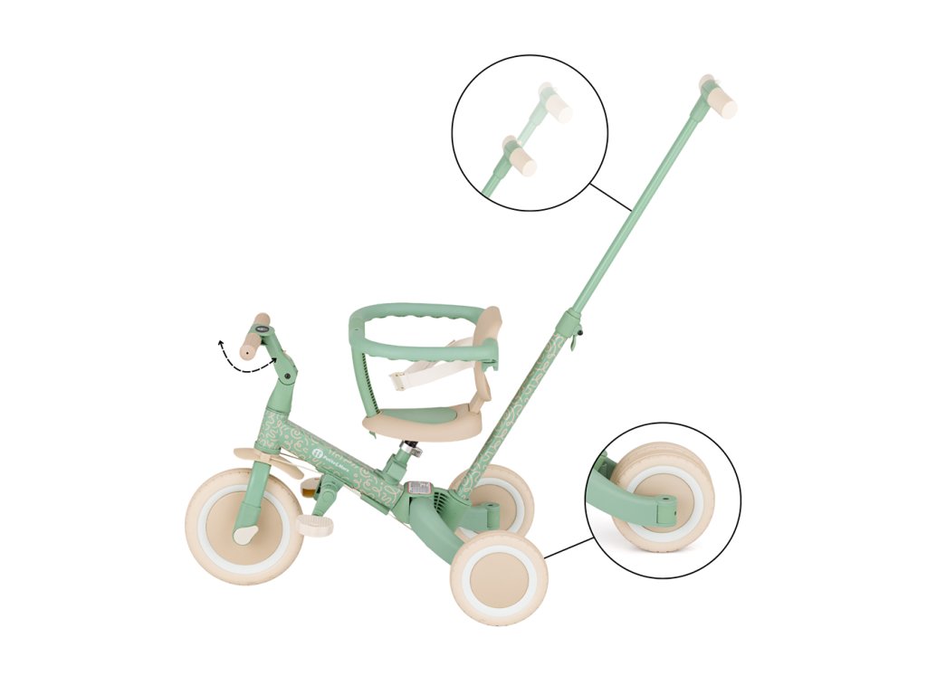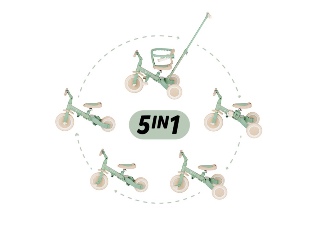 Multifunkčná trojkolka určená pre deti od 1,5 do 5 rokov alebo do 25 kilogramov je nielen dopravný prostriedok na presun a učenie sa rovnováhy, ale aj spoločník pre rastúce dieťa počas mnohých vývojových fáz. Vďaka premyslenej transformácii sa prispôsobí aktuálnym motorickým schopnostiam dieťatka – od trojkolky s asistenciou rodiča až po plnohodnotný bicykel s pedálmi.