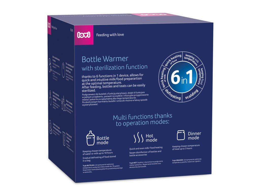 Ohrievač Lovi predstavuje ideálny a bezpečný spôsob ohrievania pokrmu. Obsahuje termostat, ktorý udržuje nastavenú teplotu veľmi dlhú dobu. Chráni pokrm pred prehriatím a stratou cenných vitamínov a minerálov. Super rýchly ohrievač LOVI automaticky nastaví dobu ohrevu pokrmu bez ohľadu na to, či je pokrm chladený, zmrazený alebo izbovej teploty.