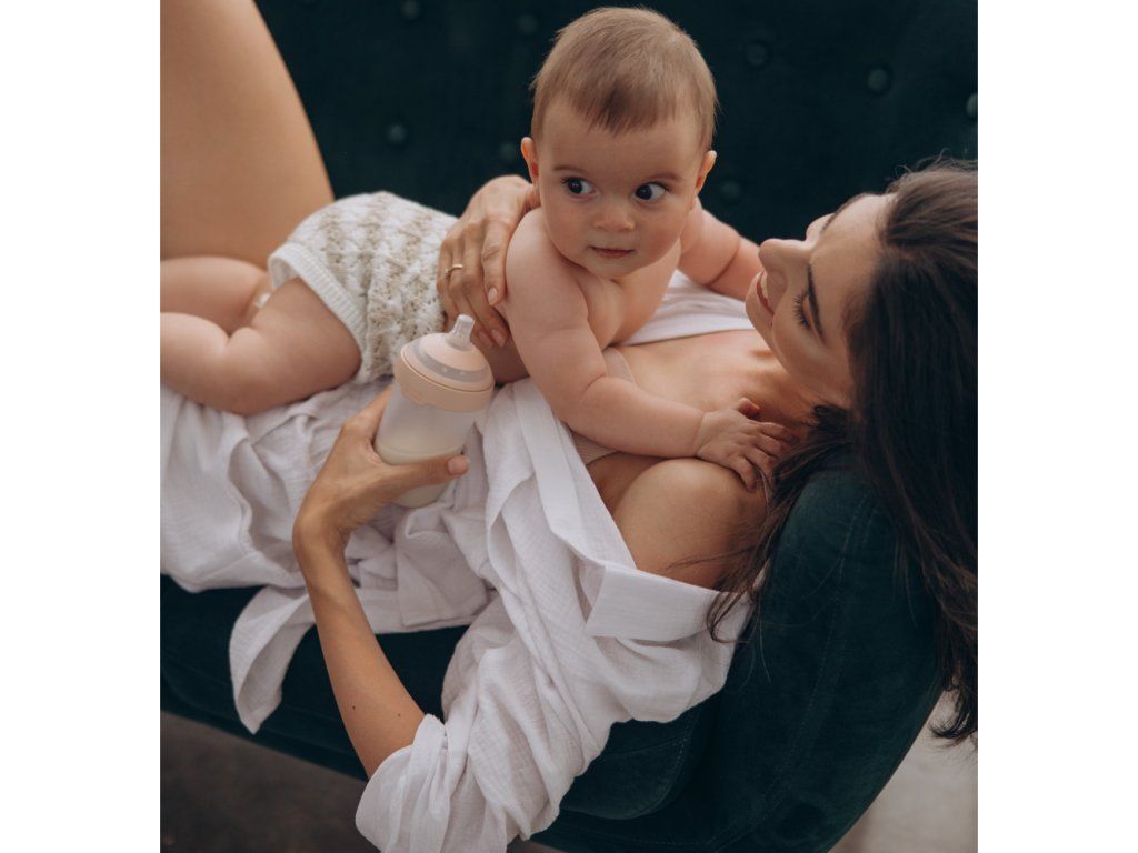 Inovatívna Fľaša Mammafeeltak blízko k prsiam mamy a bezpečné na dojčenie.