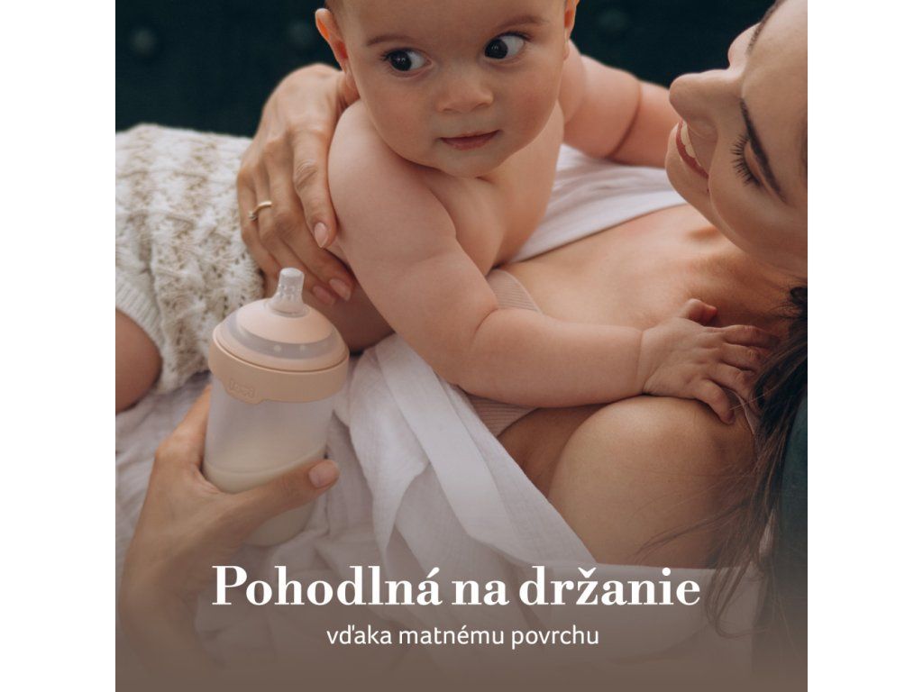 Správna podpora detských úst a správne položené pery na cumlíku umožňujú každému dieťaťu pohodlne sať bez toho, aby ústa skĺzli z povrchu cumlíka. BEZPEČNÝ SILIKÓNUnikátna technológia dvoch typov silikónu s rôznou pevnosťou. VIDITEĽNÁ MIERKAUmožňuje kontrolovať množstvo mlieka vypitého dieťaťom. POHODLNÁ NA DRŽANIESprávne proporcie fľaše, navyše fľaša je matná na dotyk, vďaka čomu je držanie pre rodičov príjemné a pohodlné. VYSOKÁ KVALITAVyrobené v EÚ, z materiálov z EurópyNeobsahuje BPAPre deti od narodenia 3m+