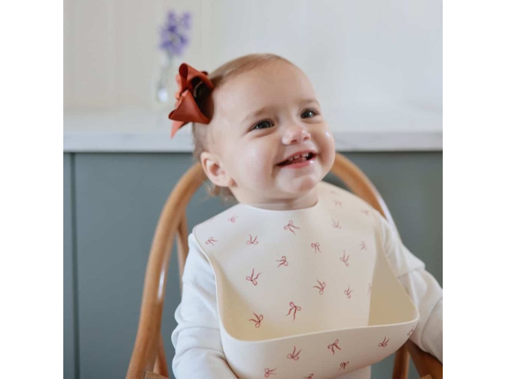 Silikónový podbradník s praktickým vreckom na zachytávanie potravy.