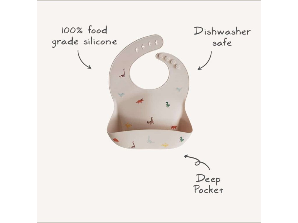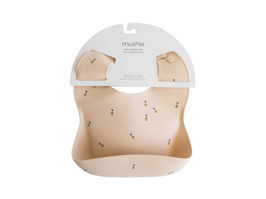 Praktický silikónový podbradník Mushie s hlbokým vreckom na zachytávanie jedla udrží dieťatko aj okolie čisté, je pohodlný na nosenie a dostupný v hravých a nadčasových dizajnoch.