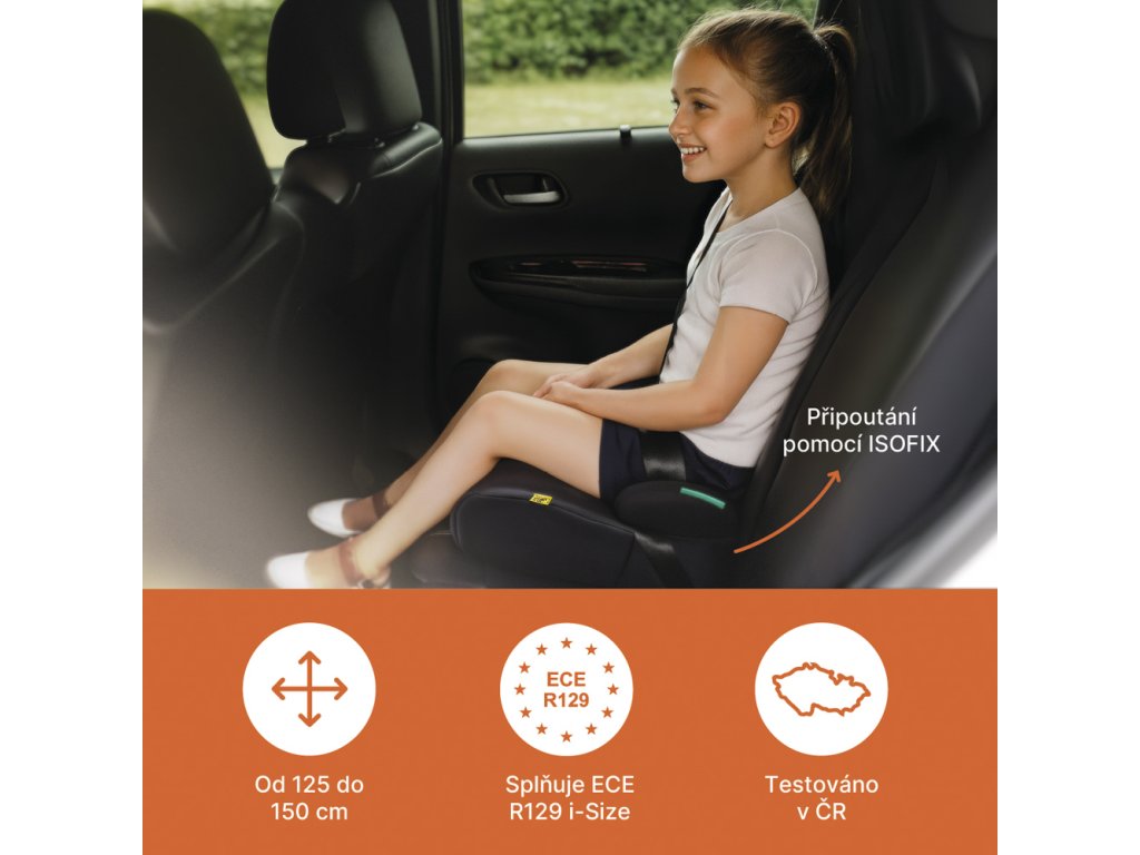 Podsedák spĺňa najnovšiu bezpečnostnú normu ECE R129 (i-Size) a má zásadnú funkciu: zabezpečuje správne vedenie 3-bodového bezpečnostného pásu cez boky a rameno, nie cez krk a mäkké brucho.