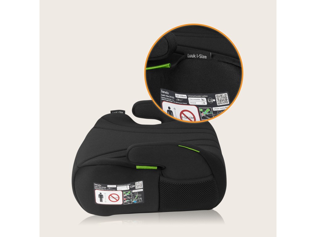Lionelo Luuk i-Size je autosedačka určená pre deti vysoké 125 až 150 cm. Držiak je určený na montáž na bezpečnostné pásy auta, v smere jazdy. Vďaka univerzálnemu spôsobu montáže je vhodný pre takmer každý model automobilu. Sedačka spĺňa prísne európske normy schválenia R129, známe tiež ako i-Size. Široké sedadlo bolo navyše potiahnuté EPE penou pre ešte väčšie pohodlie. O pohodlie malého sa starajú aj podrúčky, ktoré umožňujú telu zaujať správny postoj počas cesty.