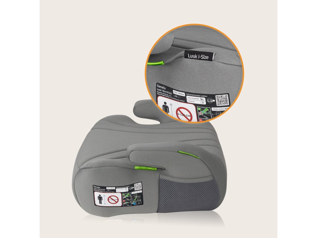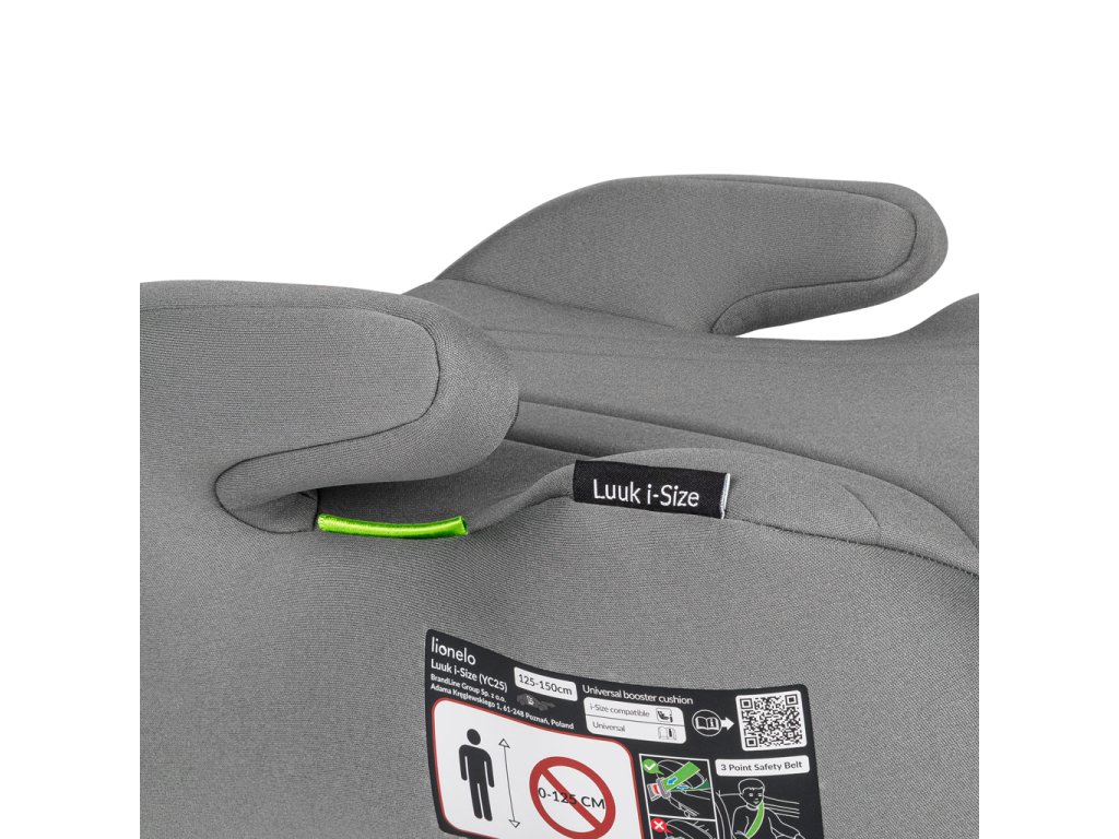 Lionelo Luuk i-Size je autosedačka určená pre deti vysoké 125 až 150 cm. Držiak je určený na montáž na bezpečnostné pásy auta, v smere jazdy. Vďaka univerzálnemu spôsobu montáže je vhodný pre takmer každý model automobilu. Sedačka spĺňa prísne európske normy schválenia R129, známe tiež ako i-Size. Široké sedadlo bolo navyše potiahnuté EPE penou pre ešte väčšie pohodlie. O pohodlie malého sa starajú aj podrúčky, ktoré umožňujú telu zaujať správny postoj počas cesty.